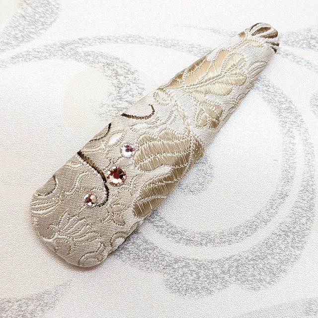 7センチのスリーピンにかぶせてます。 綿クッション入ってます。 ラインストーン付けてます。 金銀刺繍の入った着物 裏は綿ブロード生地です。 お土産やプレゼントに人気があります。 お客様のリクエストで作りました。 結構お気に入りです。(*^_^*) 昔の着物の色柄が素敵なので作りました。 ヴィンテージ生地や古着、服地など 気に入った生地でも作りました。 パッチンなので大量の髪は留めれません。 ゴムなどで留めた上から 少し髪をすくって留めて飾りにとか 横髪を留めるとかおススメ。 着物は主に古布を使っています。 古着や海外のデッドストック生地、最近の生地など 何でも気に入った生地をミックスして作品を作っています。 毎日使用すると擦れてくる生地もあります。 耐久性の面では古布は限度があります。 ご理解の上検討お願い致します。 ご不明点はお聞きください。 古いものは昔誰かが使っていたから汚れてて当たり前と思ってます。 だから多少のシミや汚れ・擦り切れや穴は 「これも古布の歴史的魅力」で気にせず使用しています。 でもカラットの判断基準から使用に耐えない部分は省いてます。 (もちろん洗濯しております!) 他サイトにも同じものを載せているため ご購入後に商品がない場合があります。 その時はオーダー、 もしくは返金など対応させて頂きます。 申し訳ありませんがよろしくお願いします。