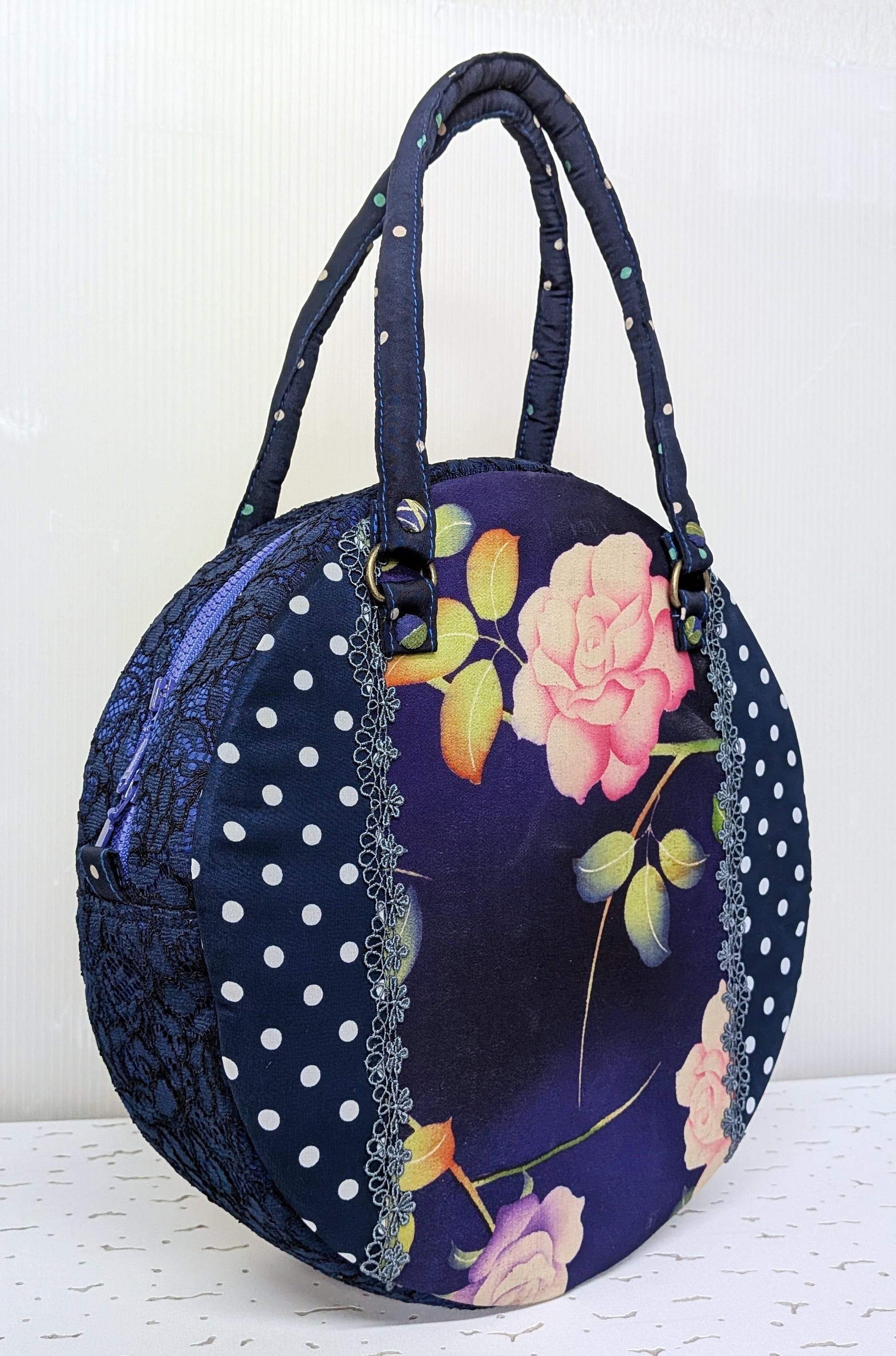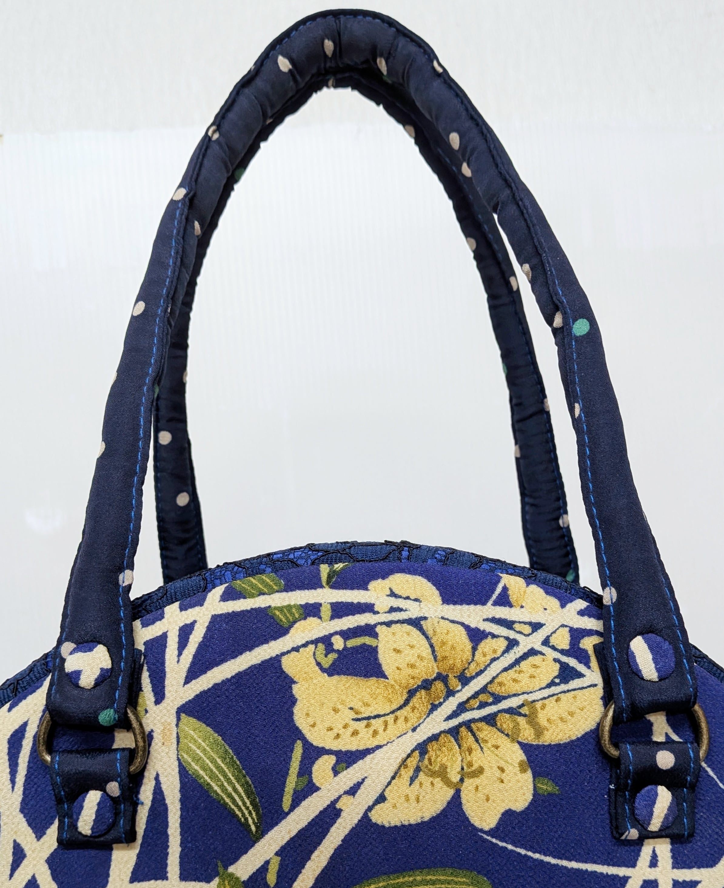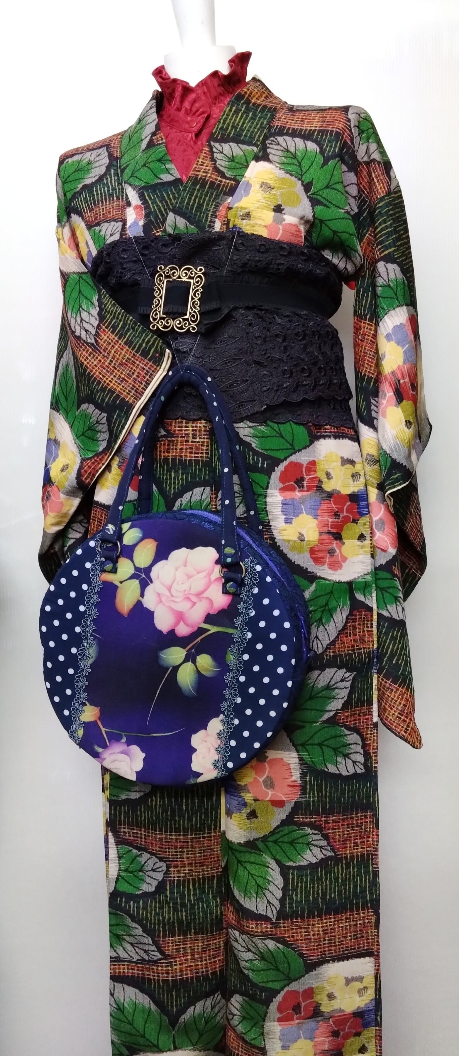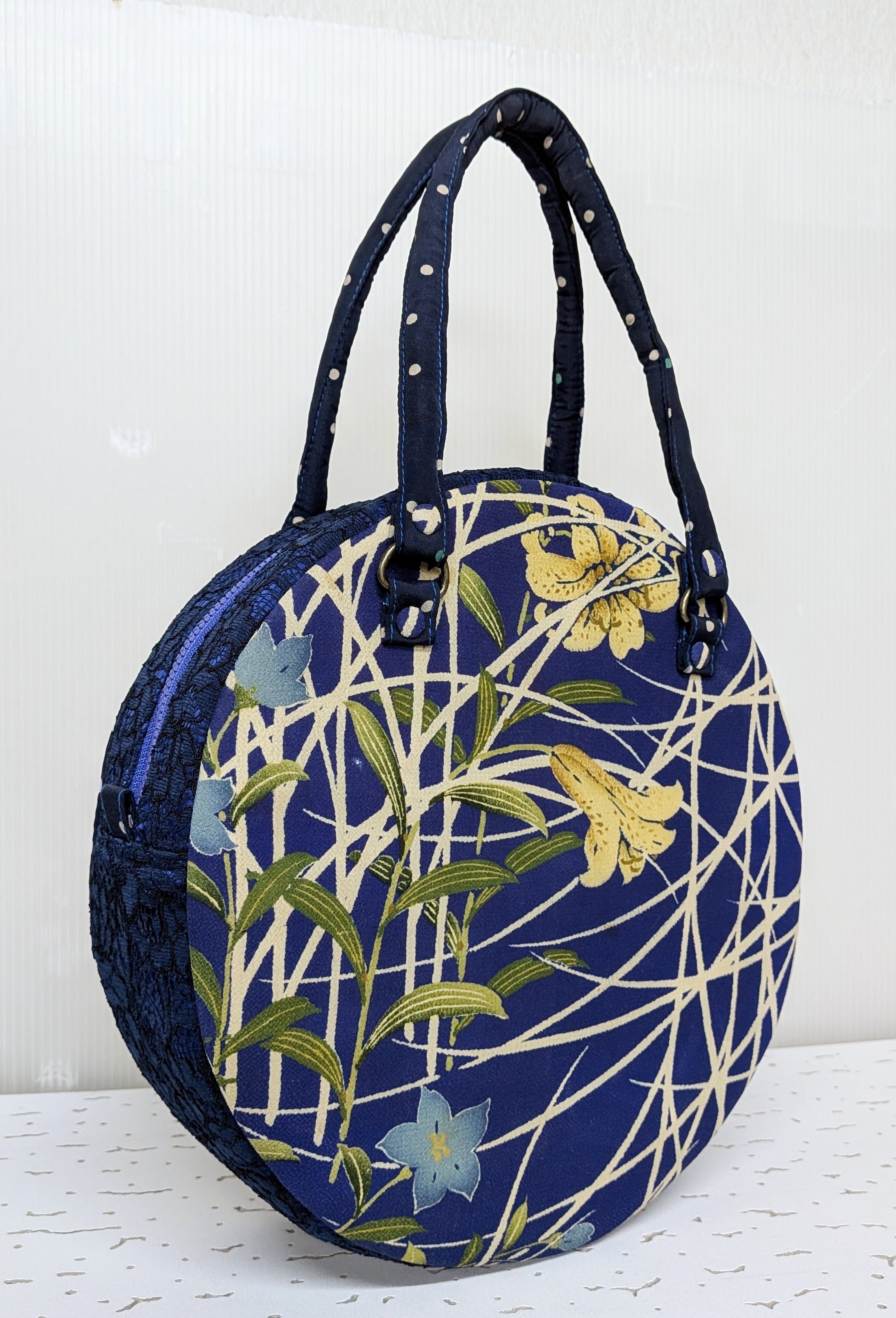 丸型ボストン大 百合と薔薇の着物×紺コードレース