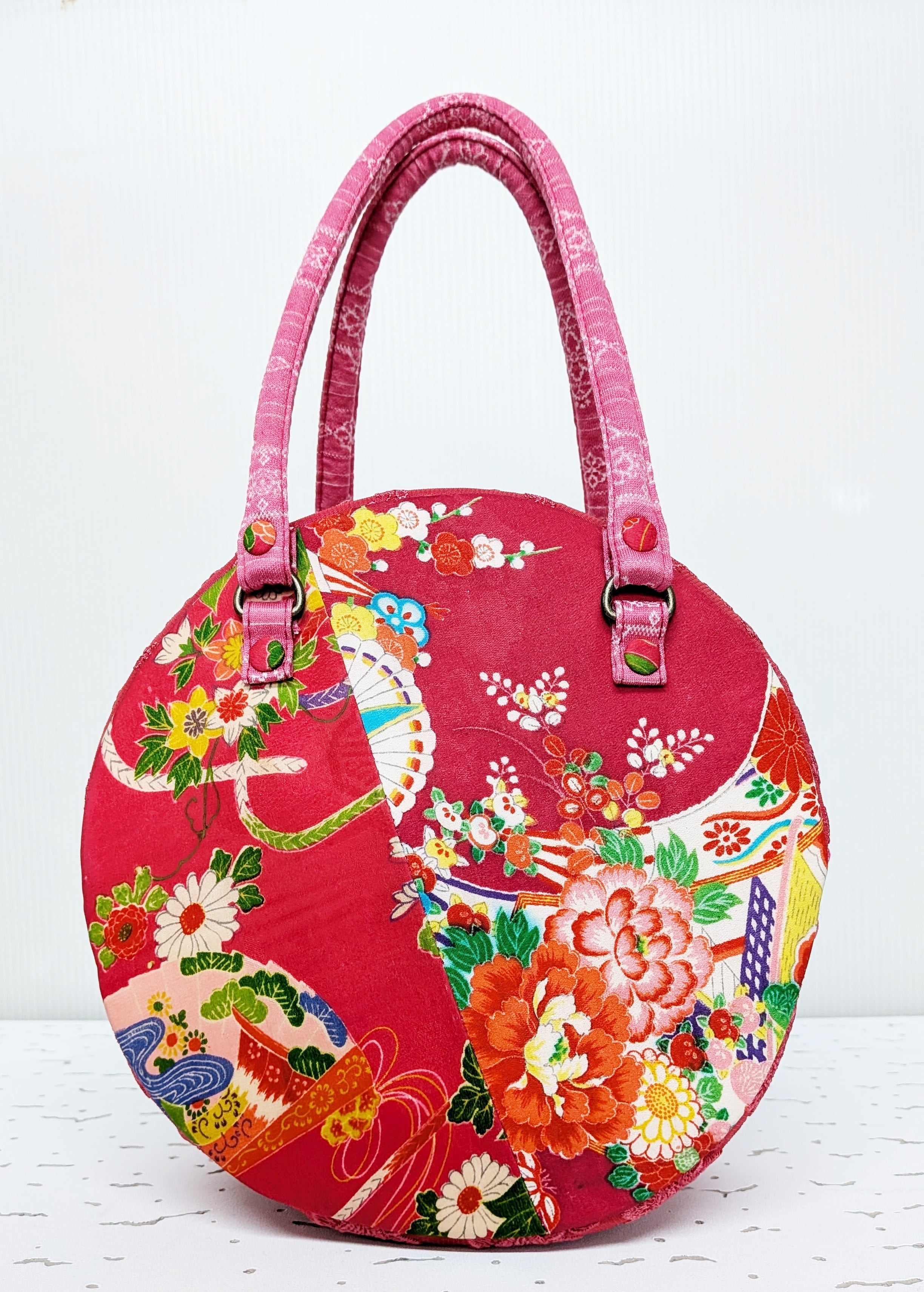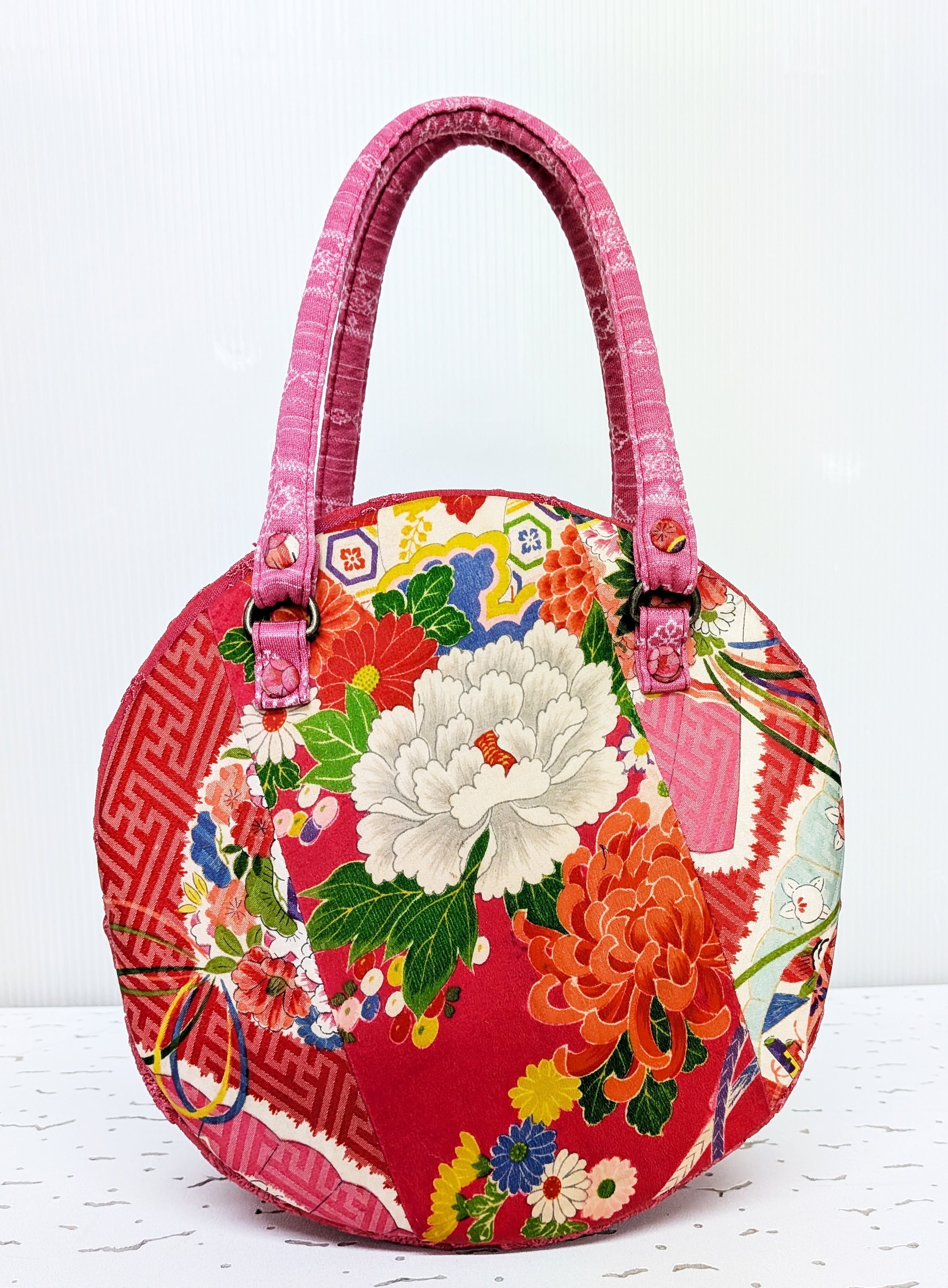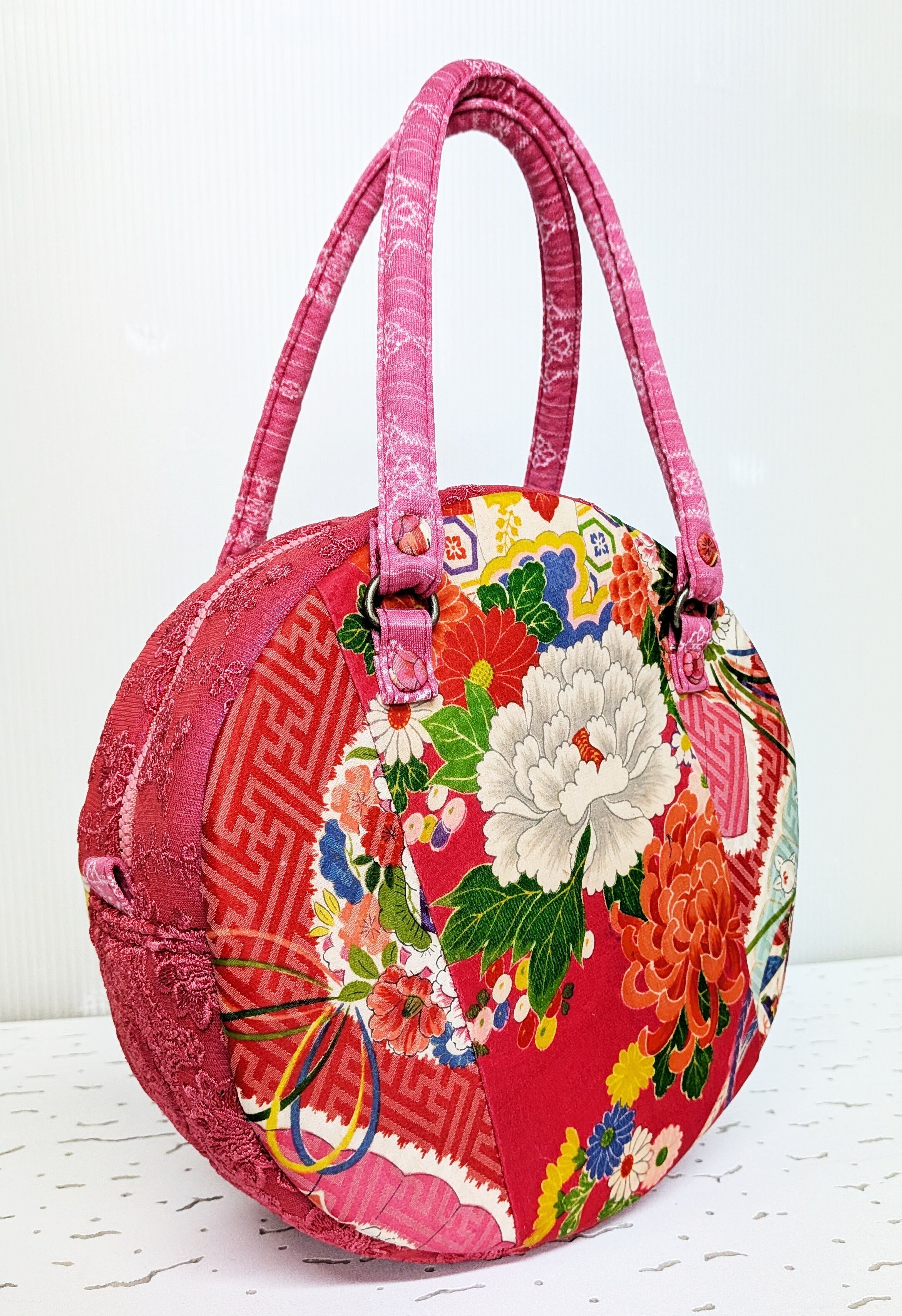 丸型ボストン小 着物張り合わせ×マゼンタレース