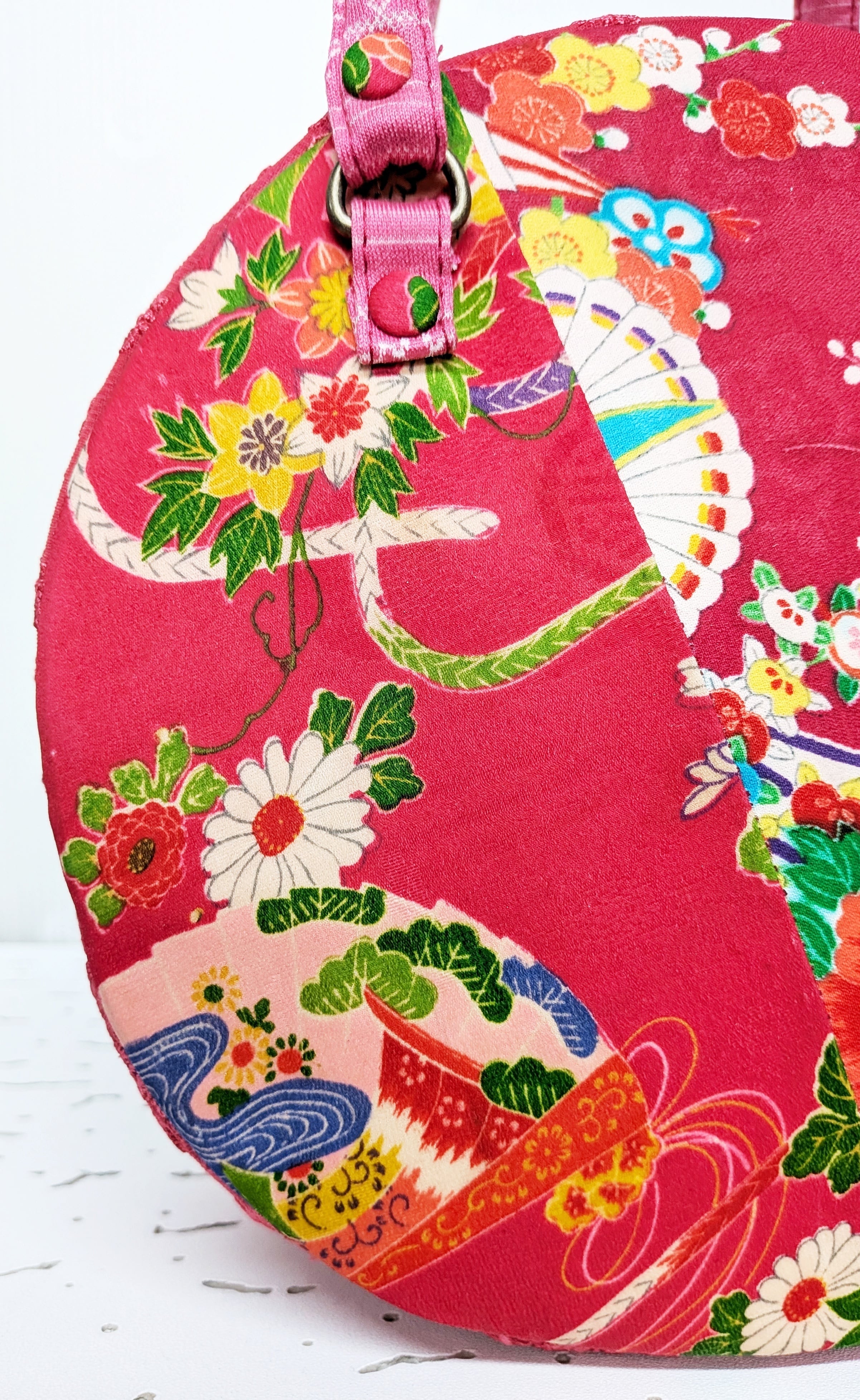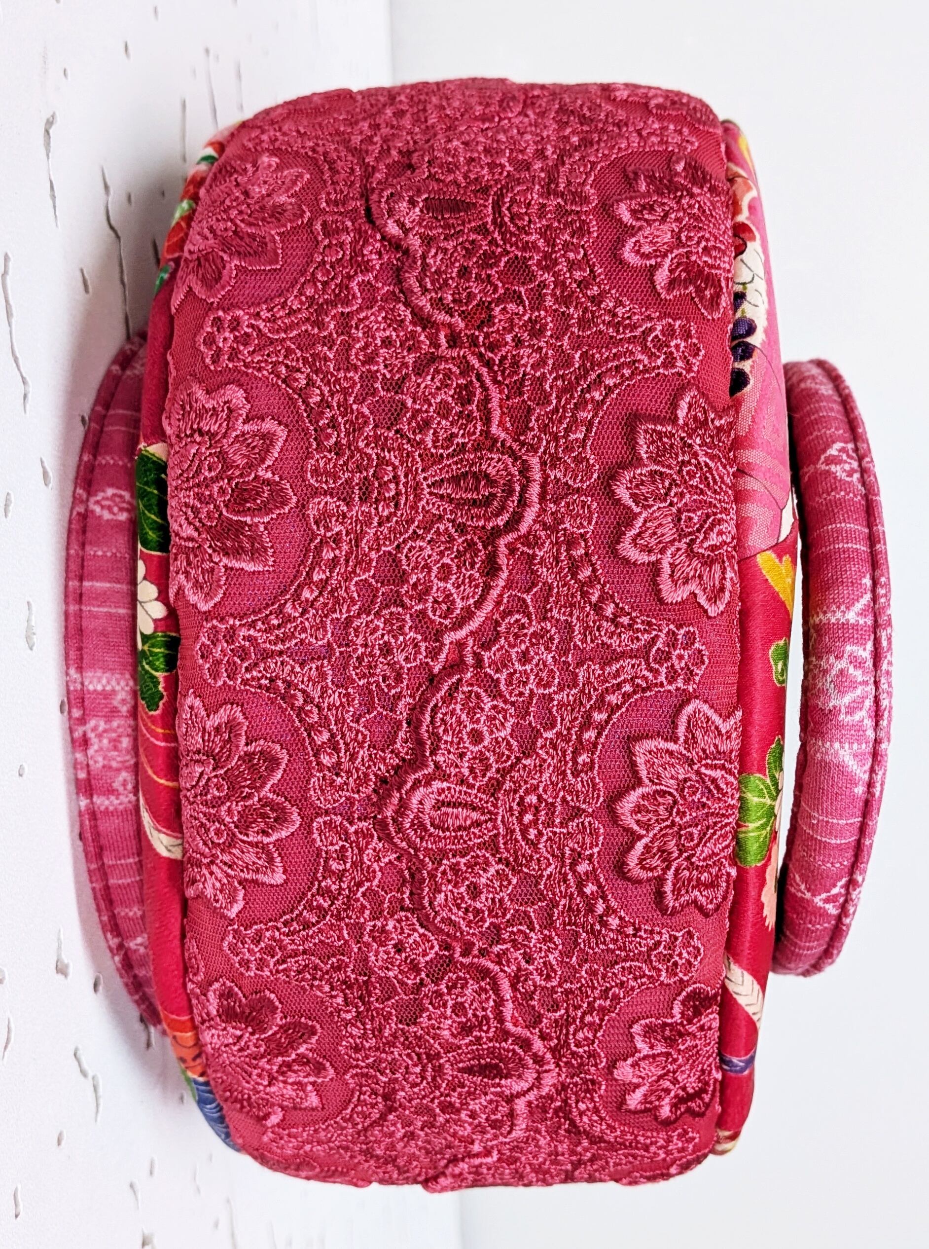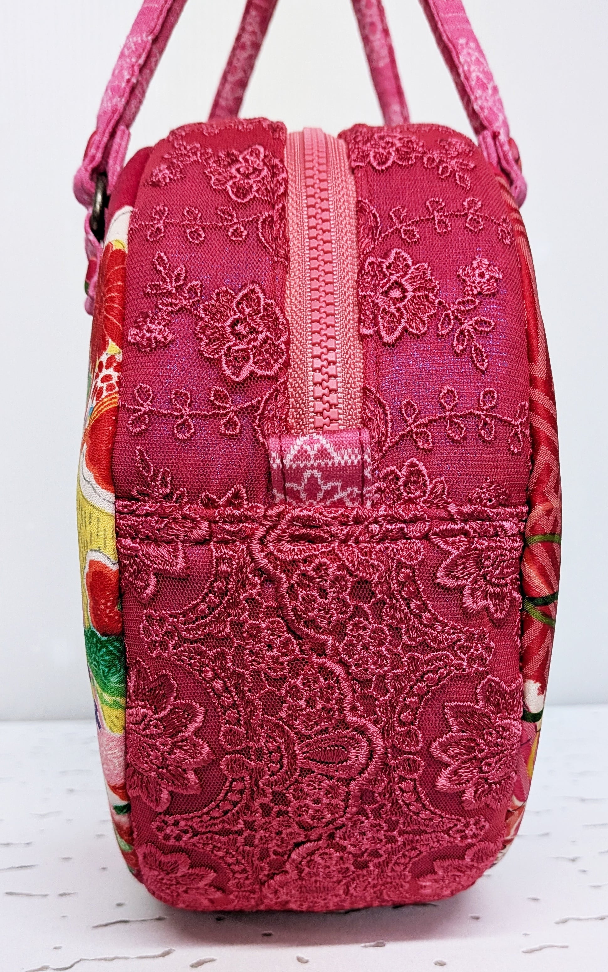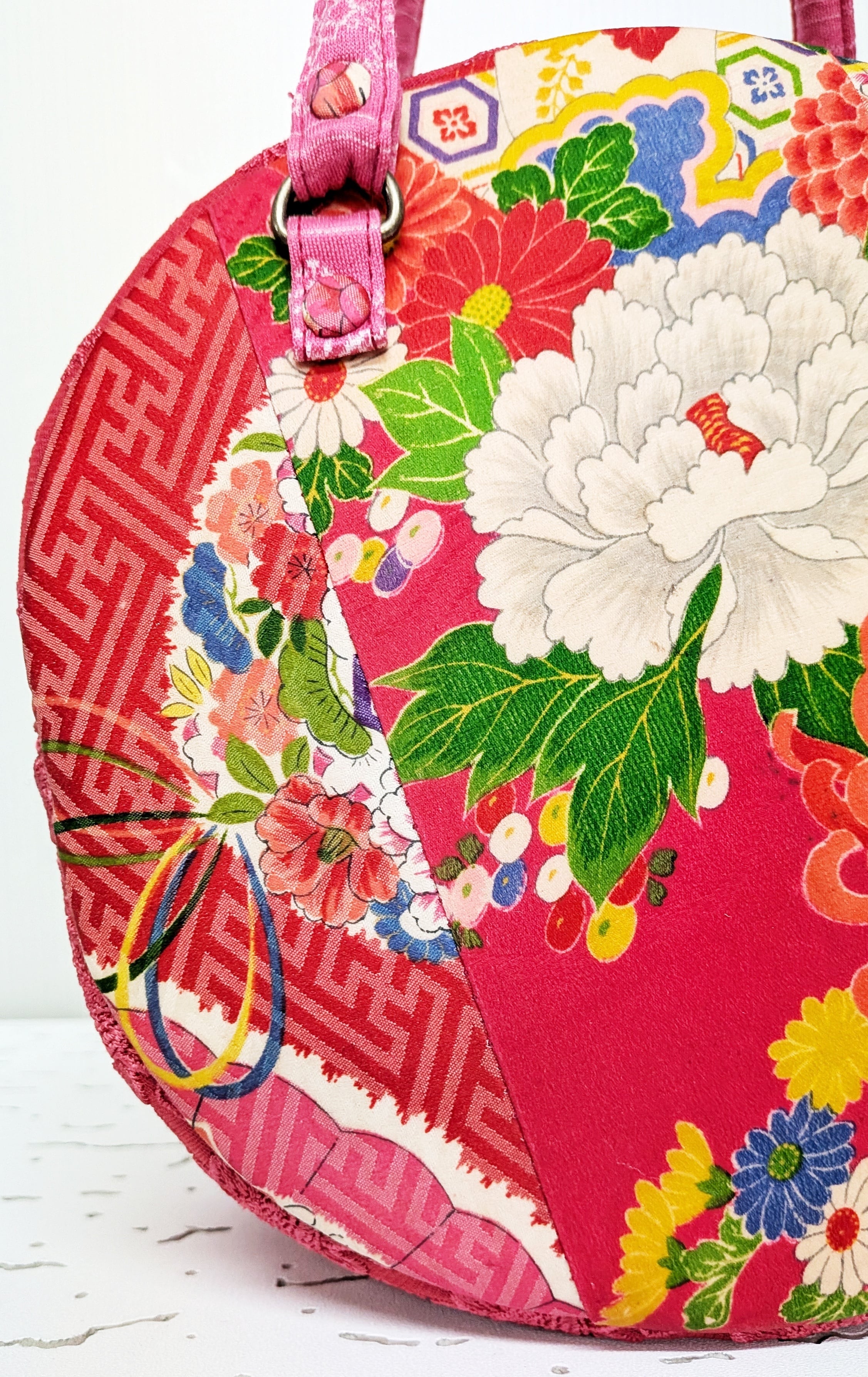 丸型ボストン小 着物張り合わせ×マゼンタレース