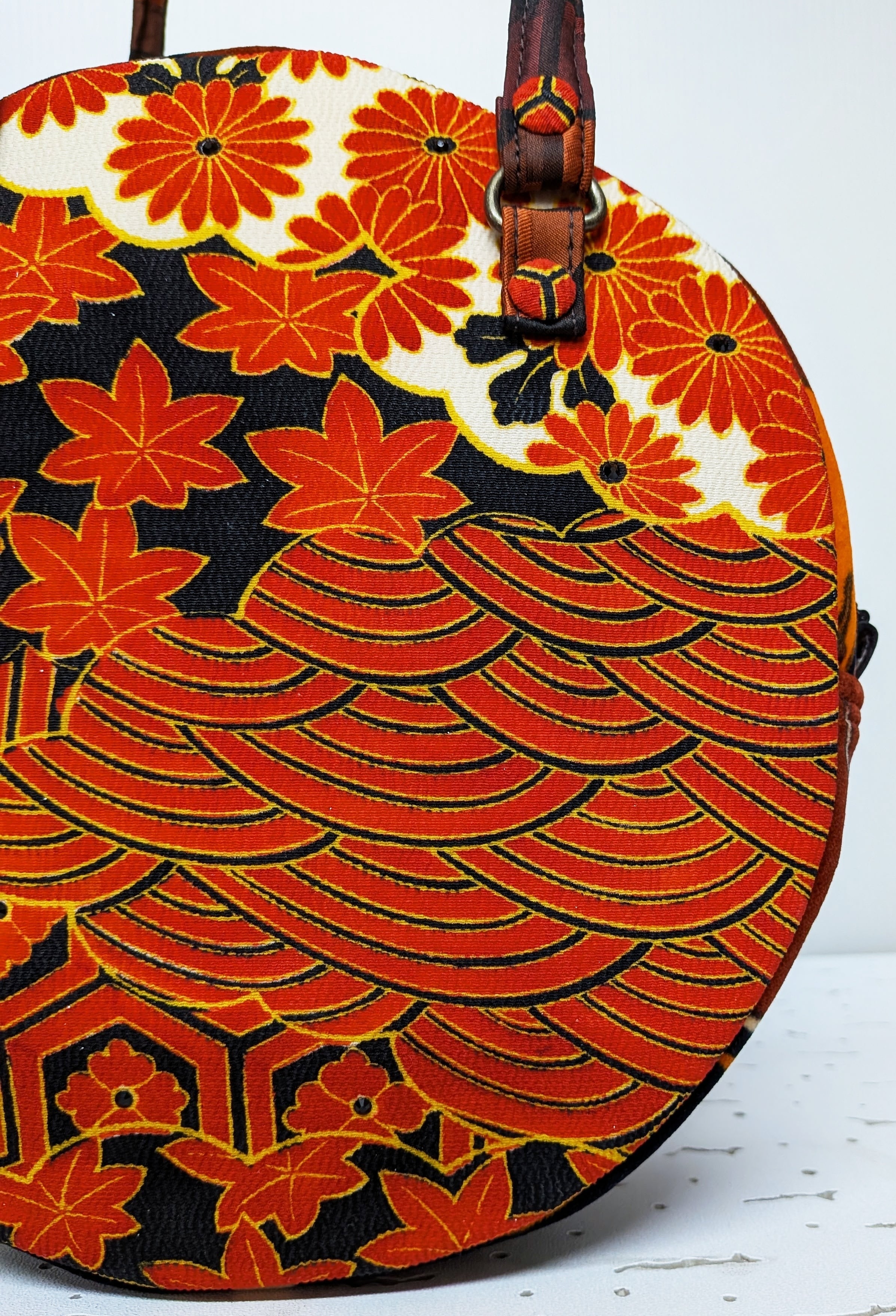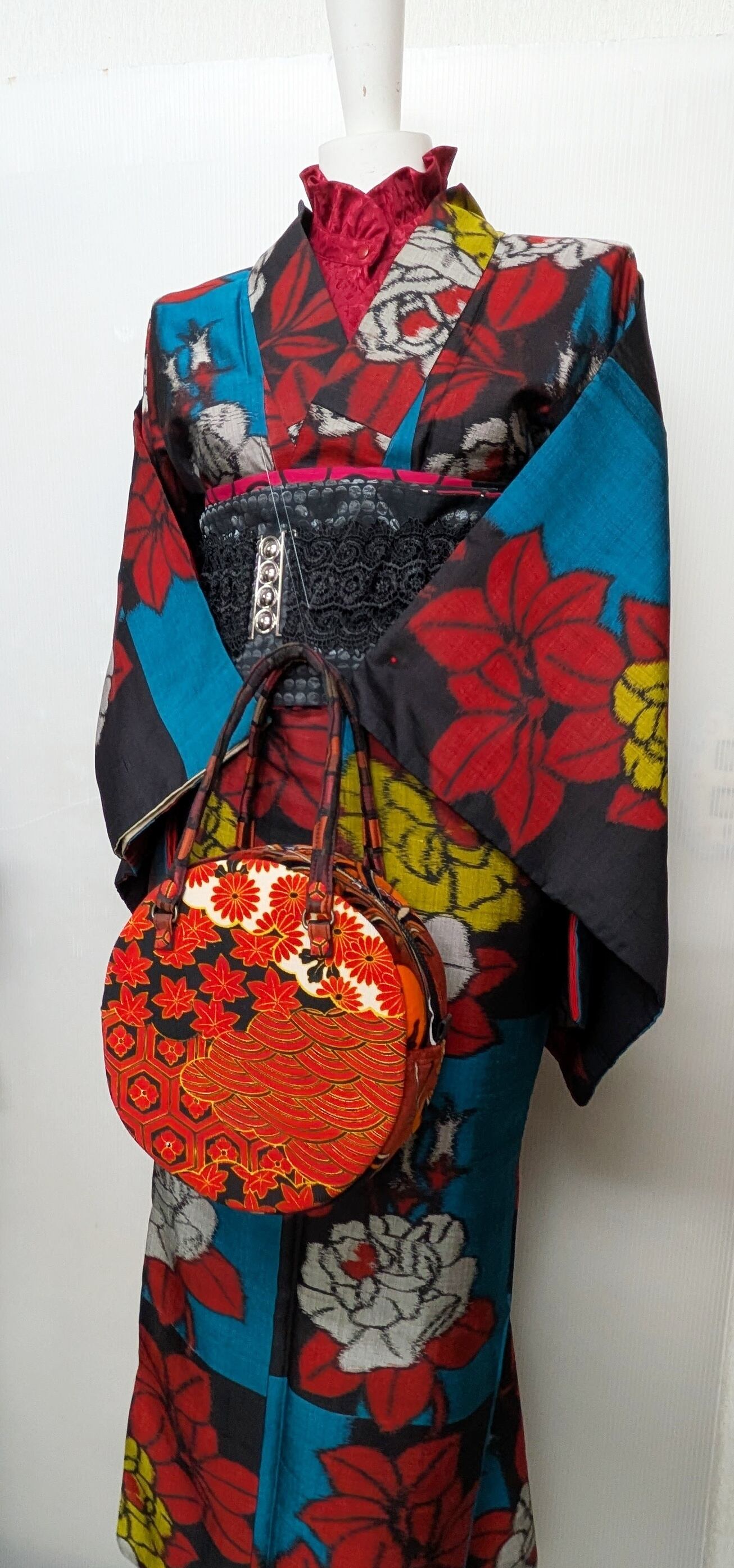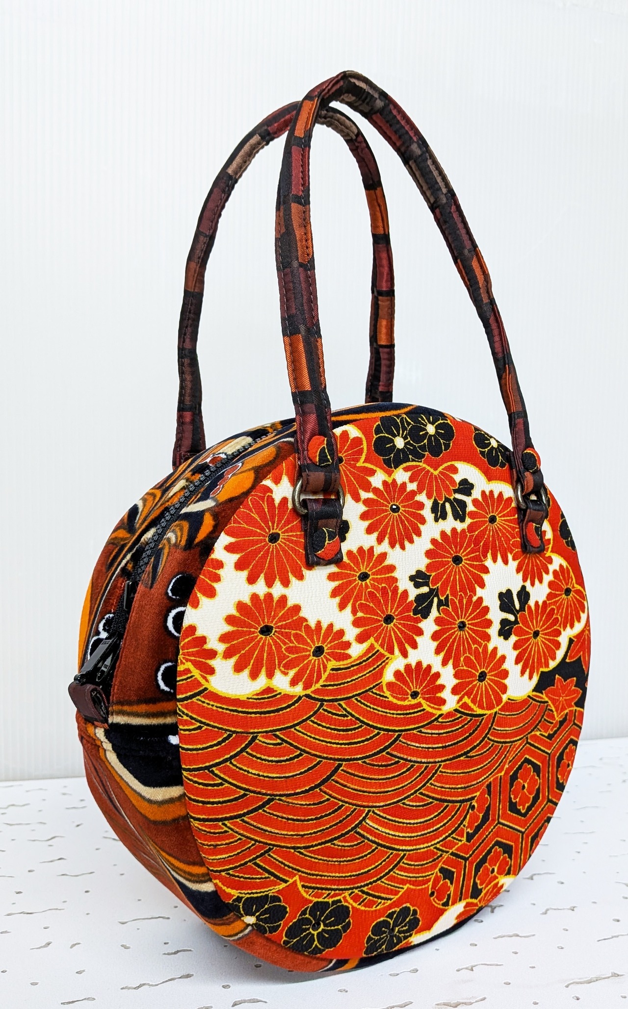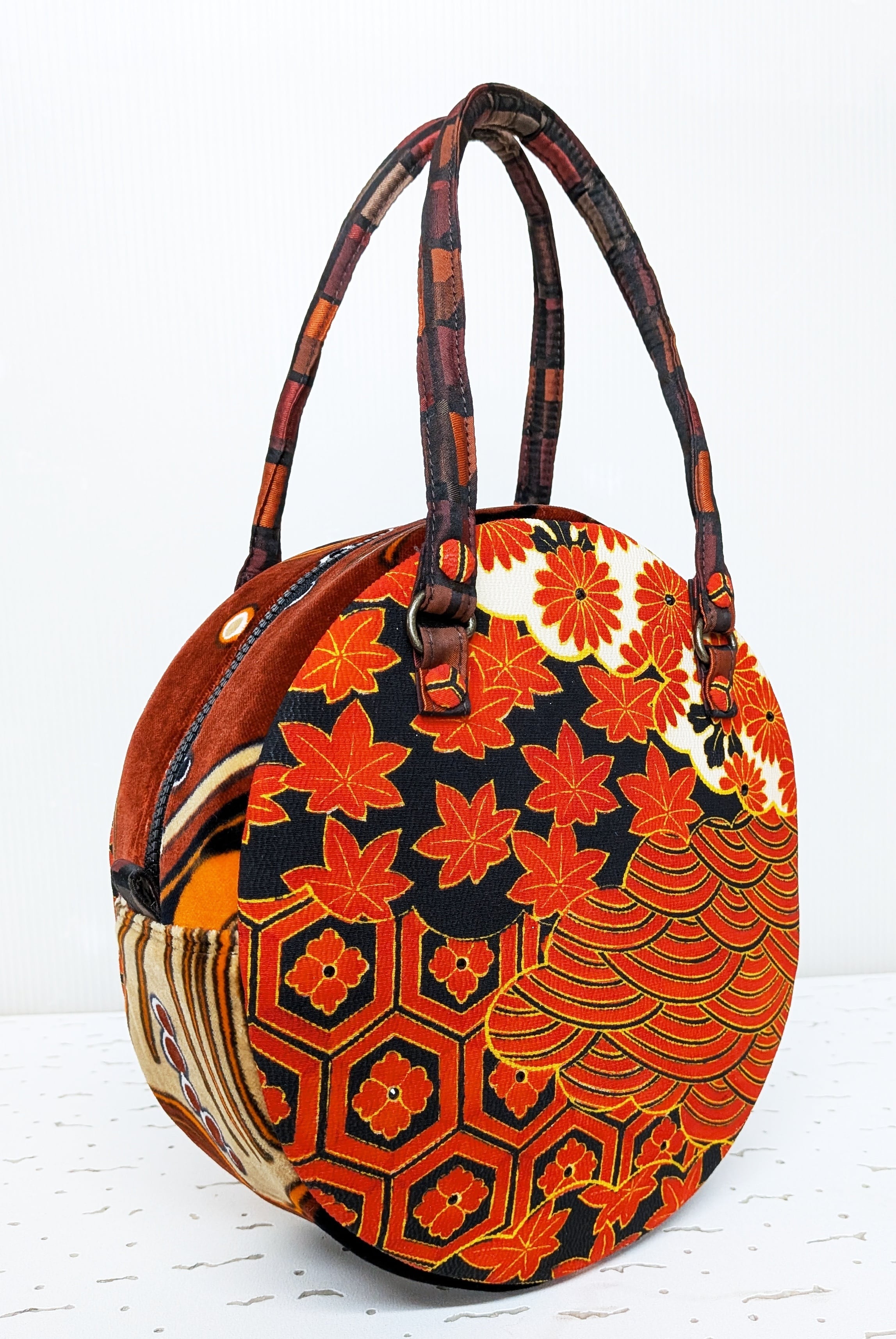 丸型ボストン小 菊紅葉青海波の着物×別珍