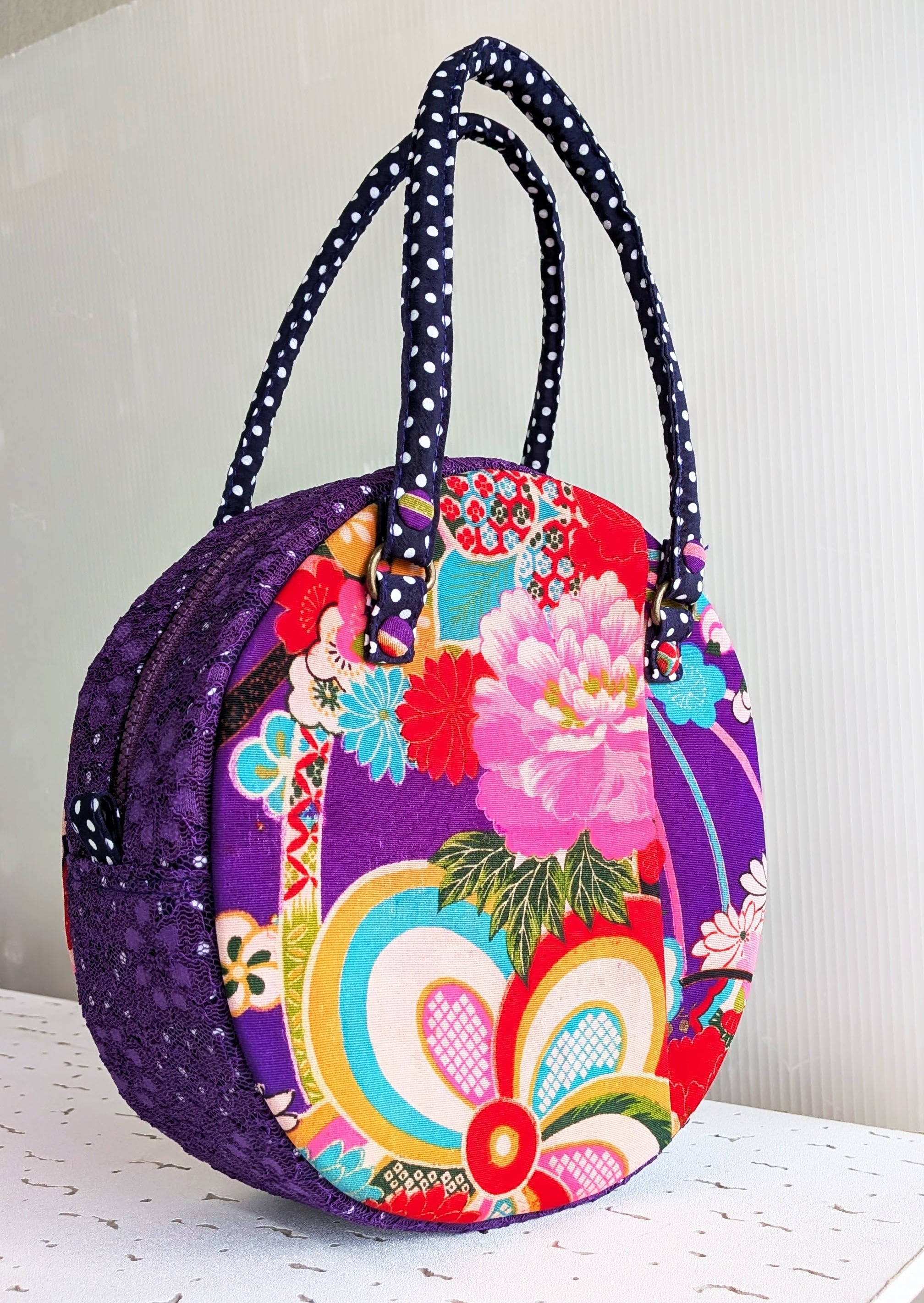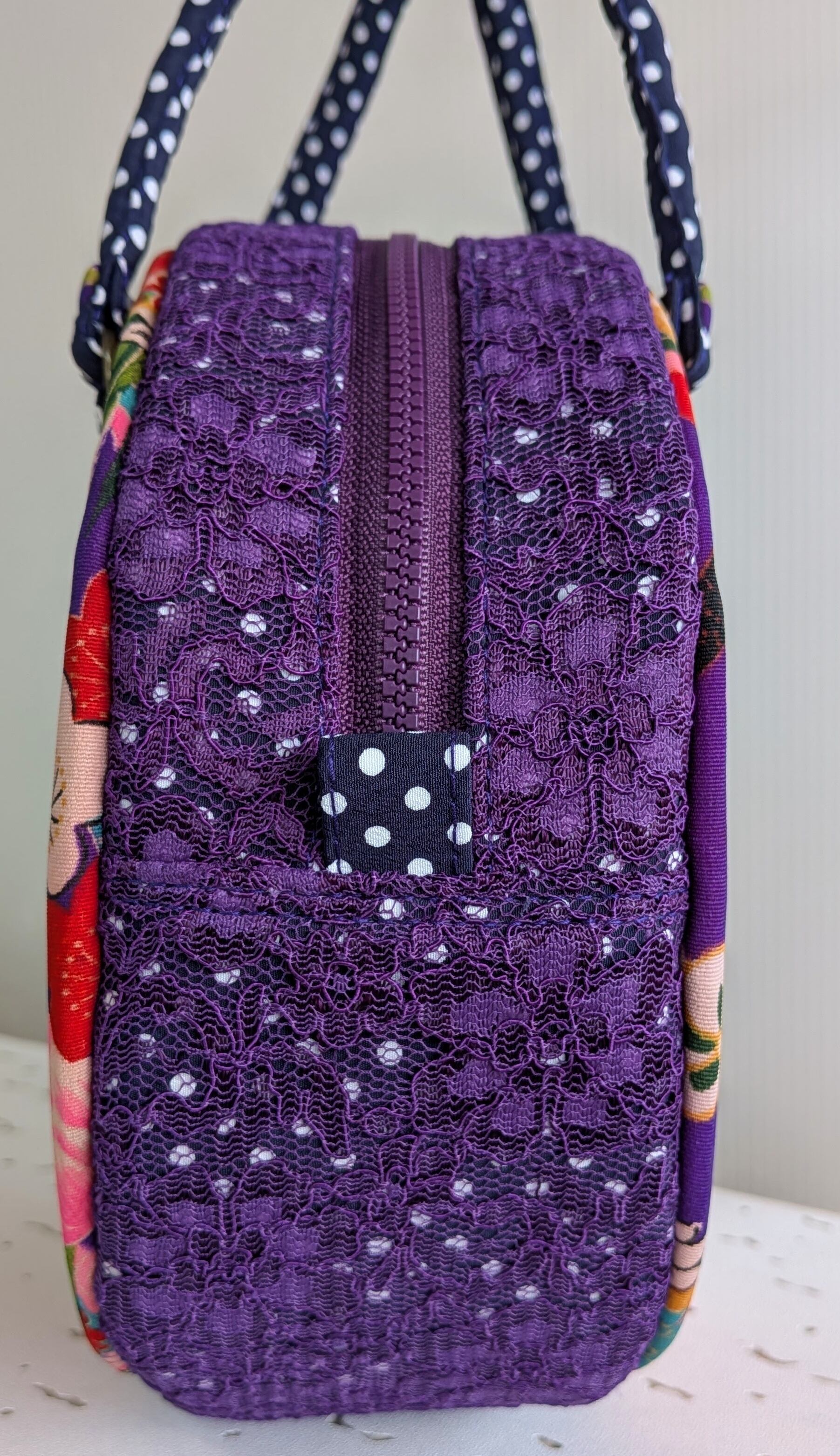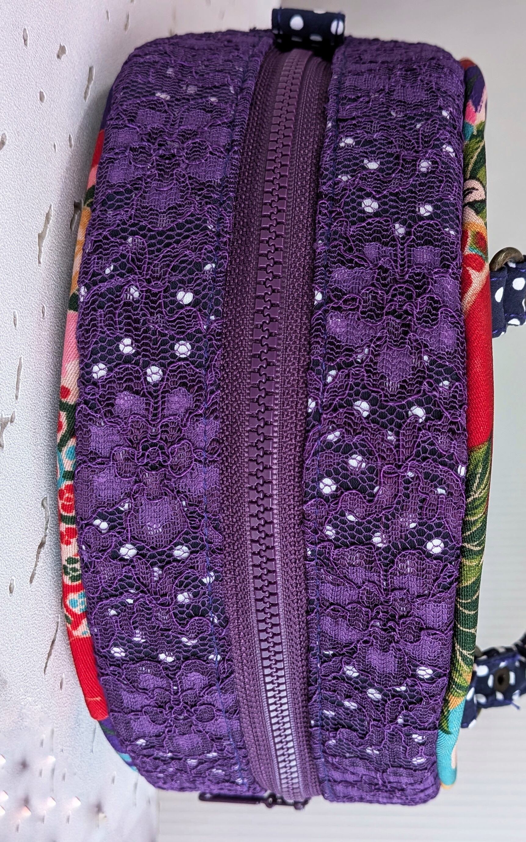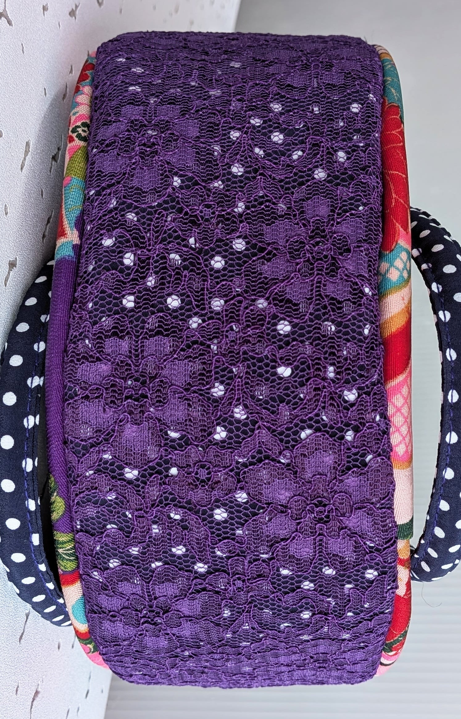 マチは持ち手と同じ水玉生地に紫レースを重ねて