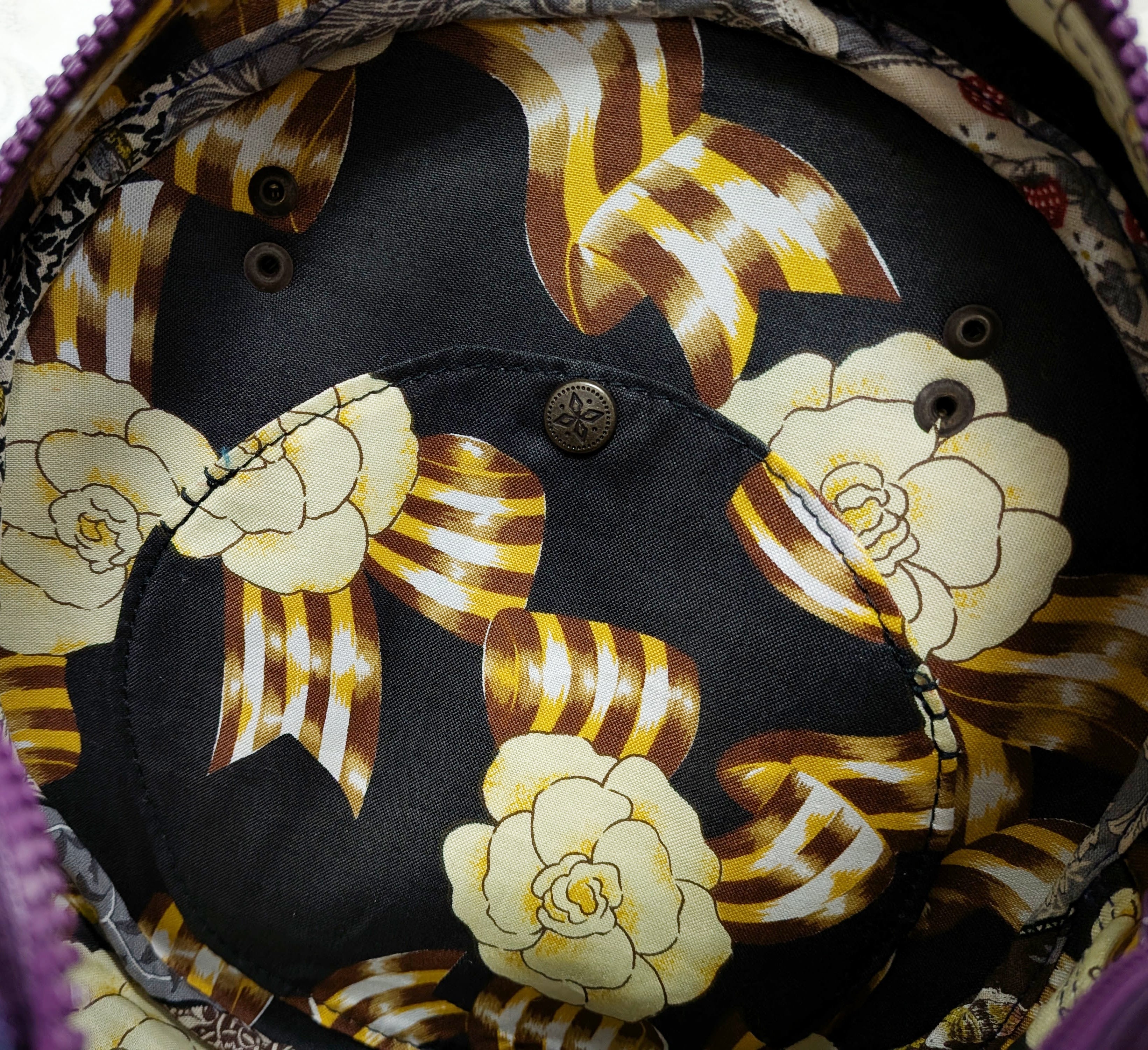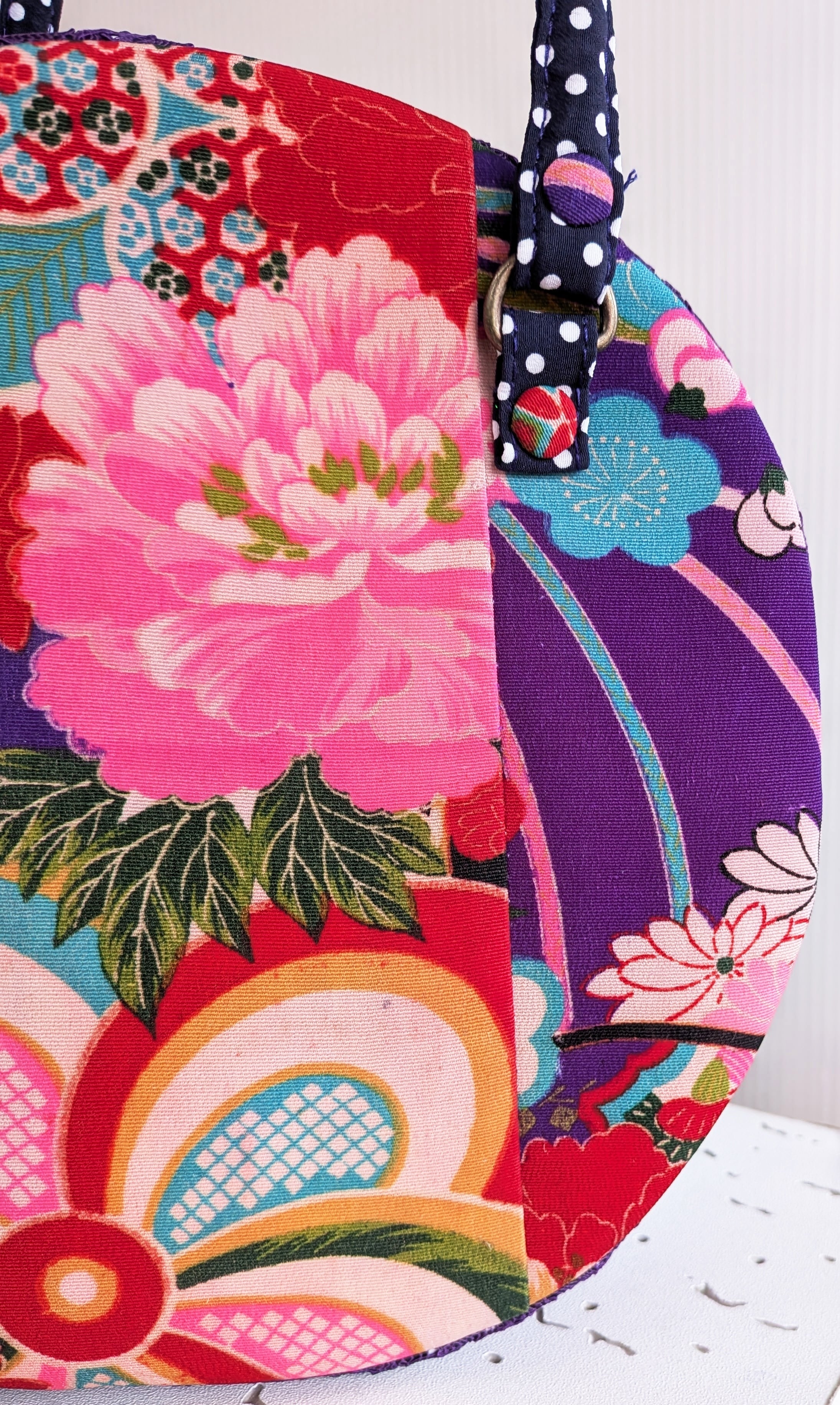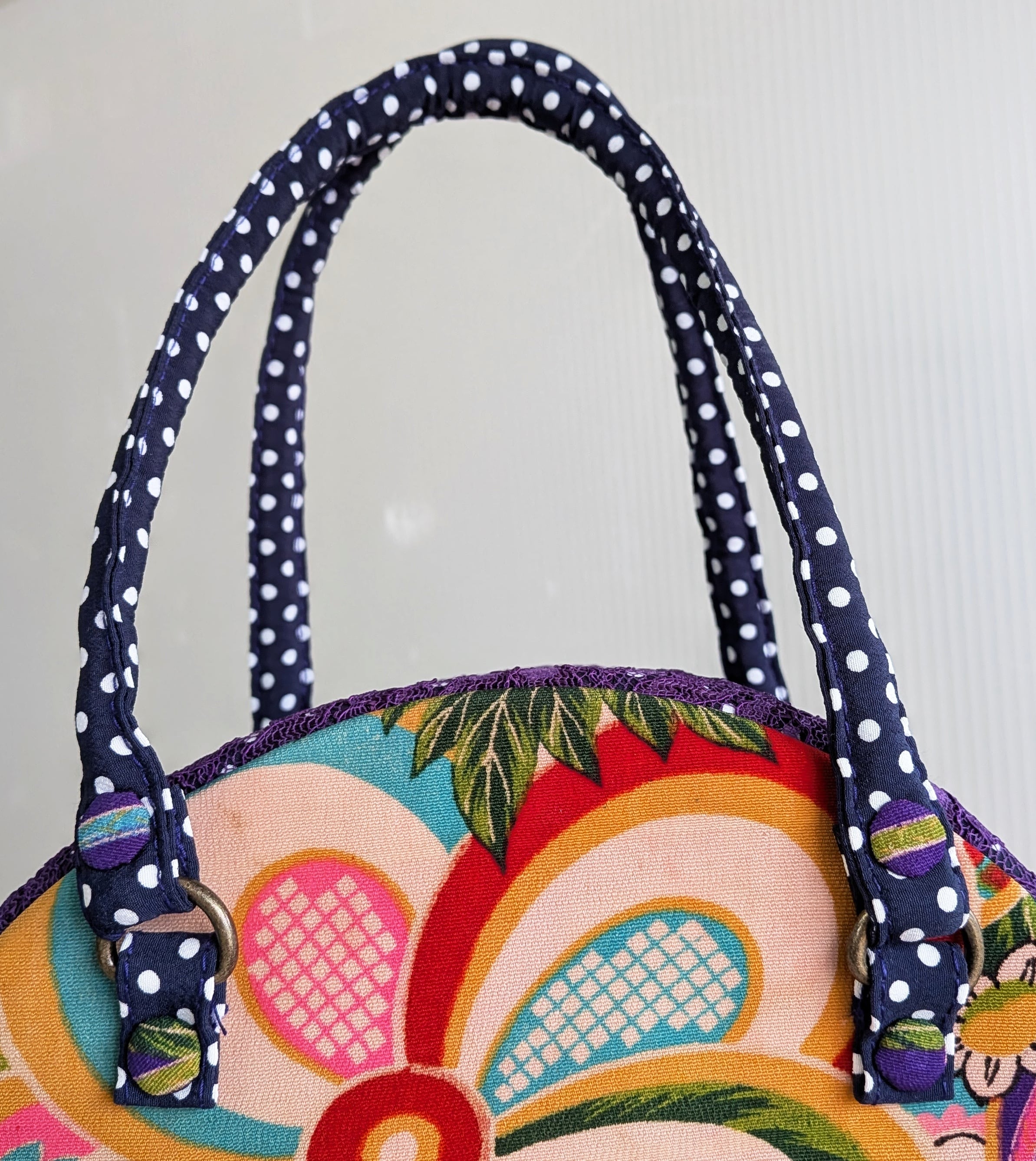 マチは持ち手と同じ水玉生地に紫レースを重ねて