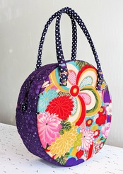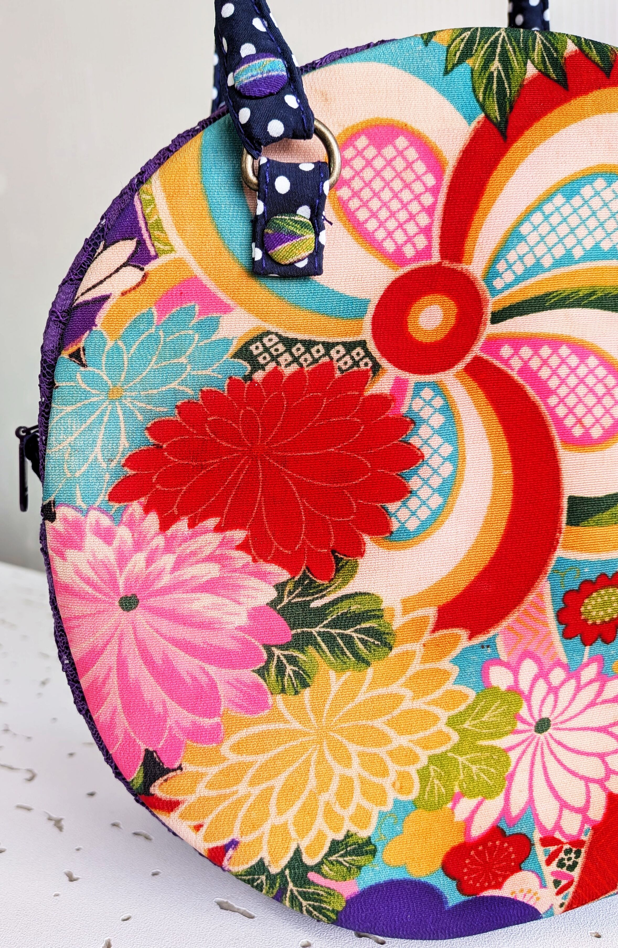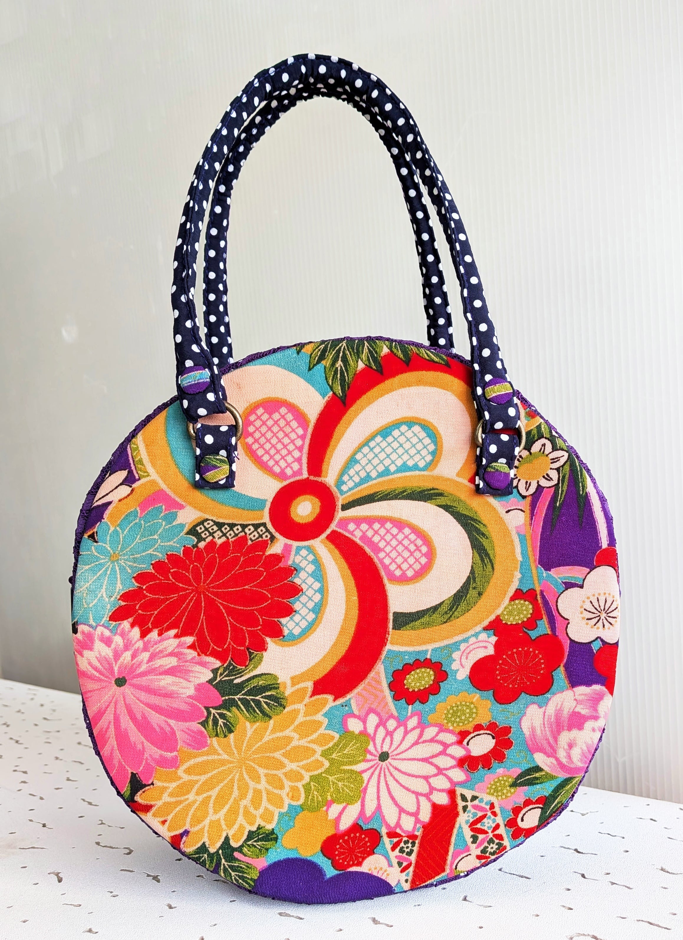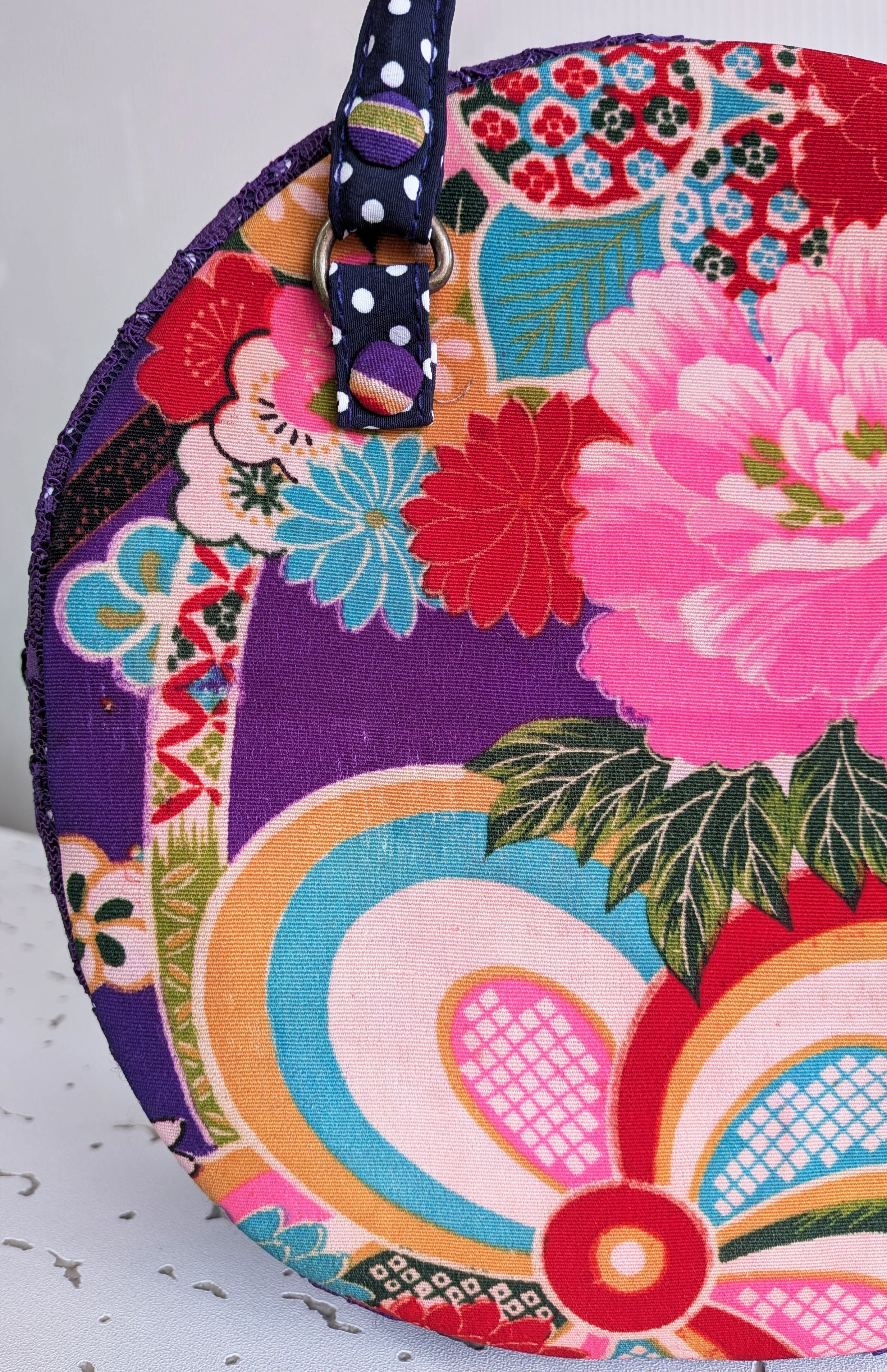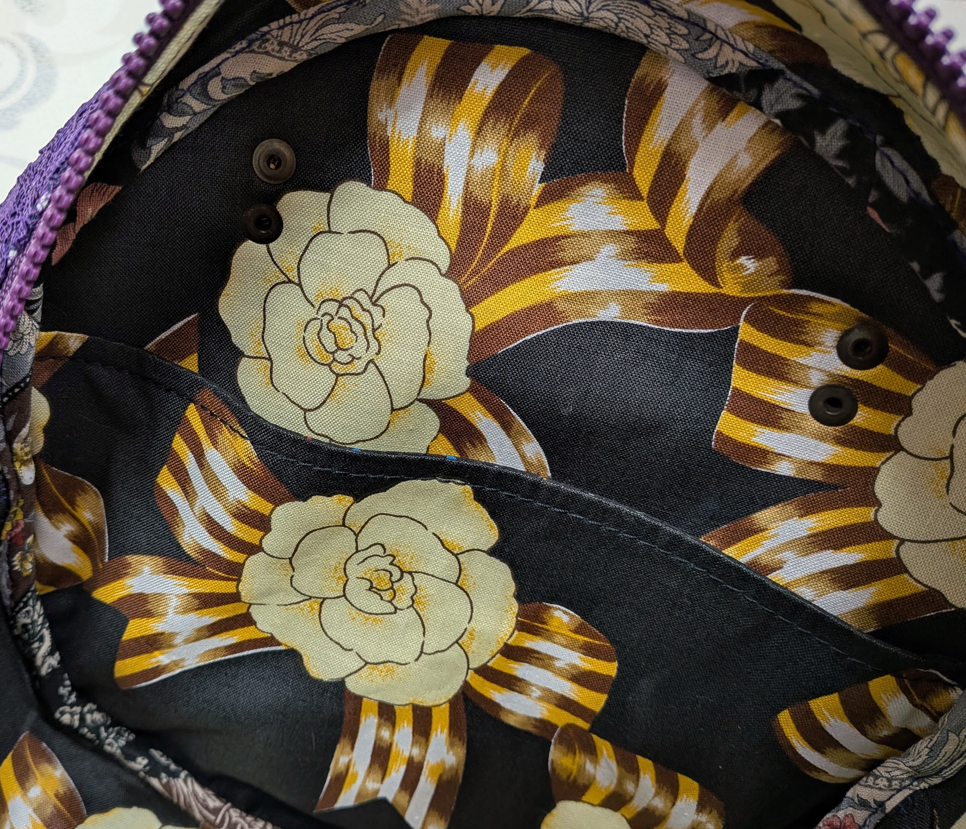 マチは持ち手と同じ水玉生地に紫レースを重ねて