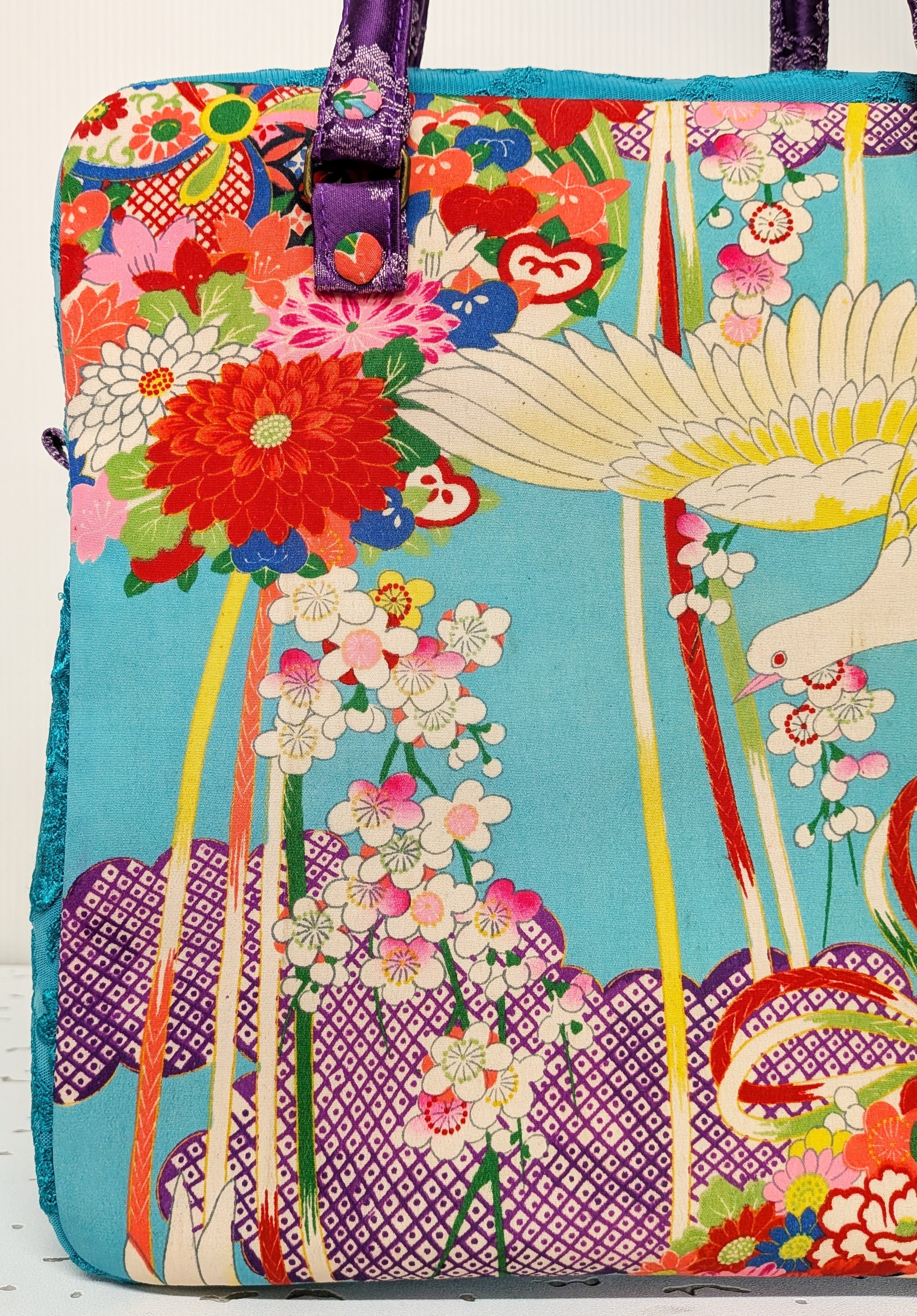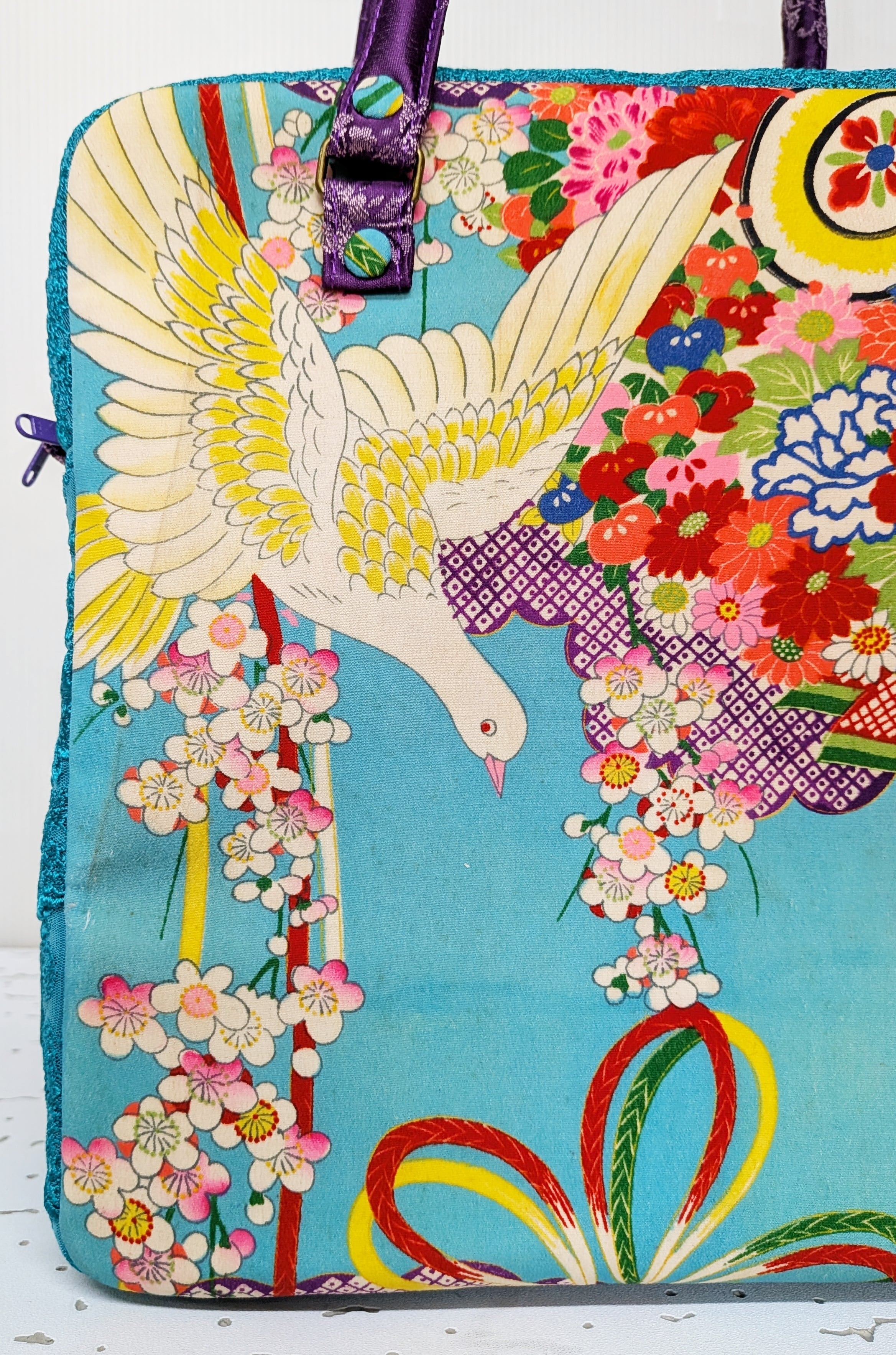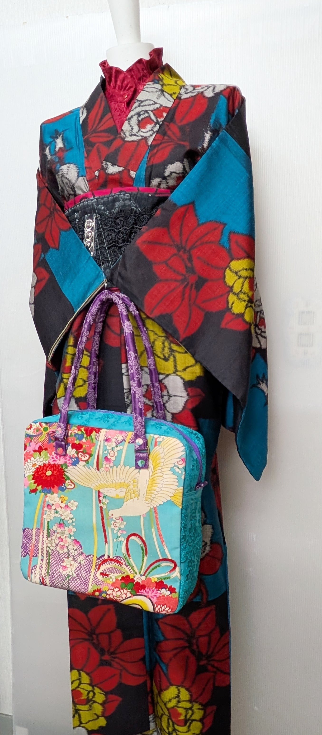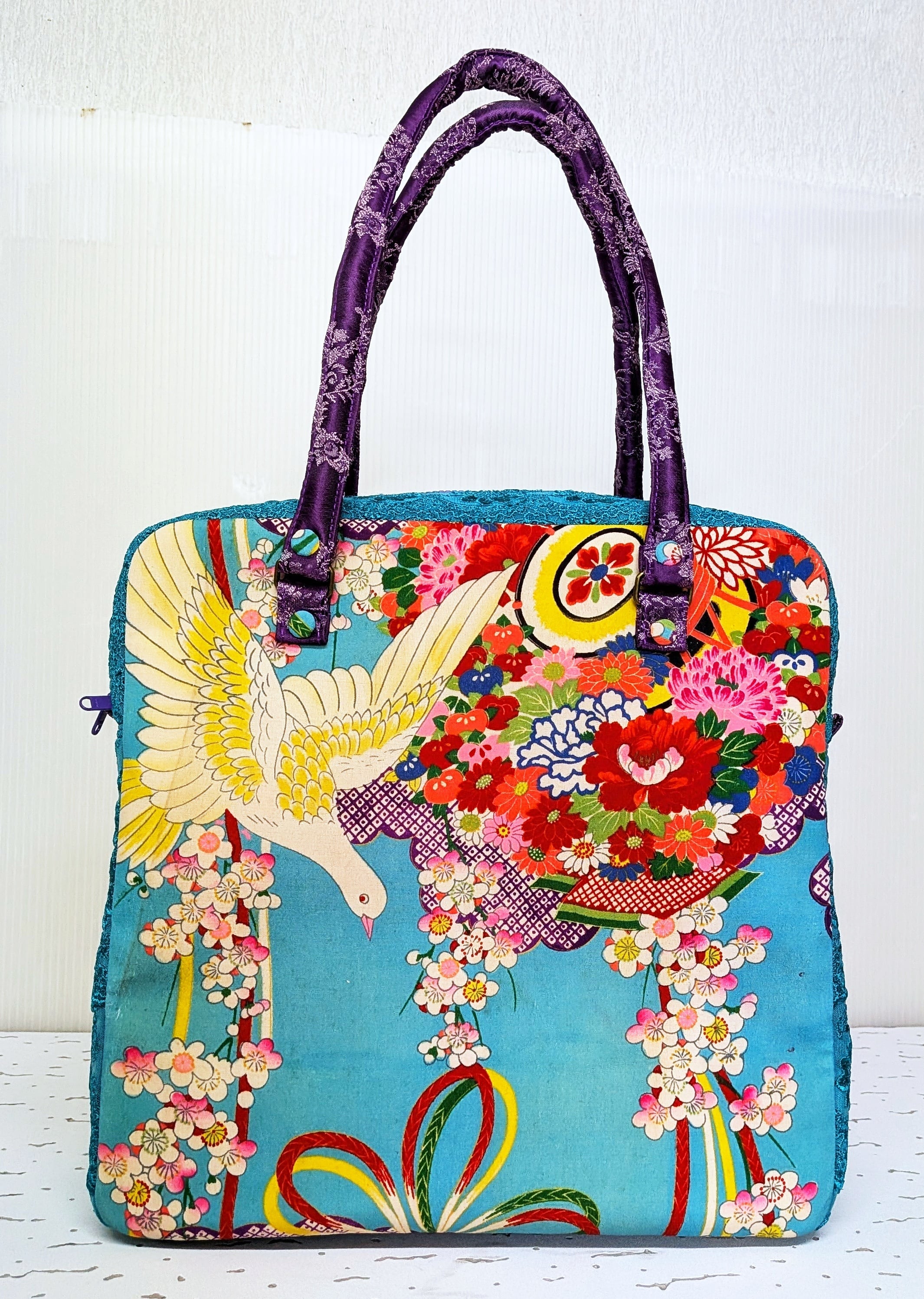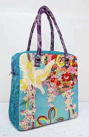 carréバッグ 鳩の着物×ターコイズレース