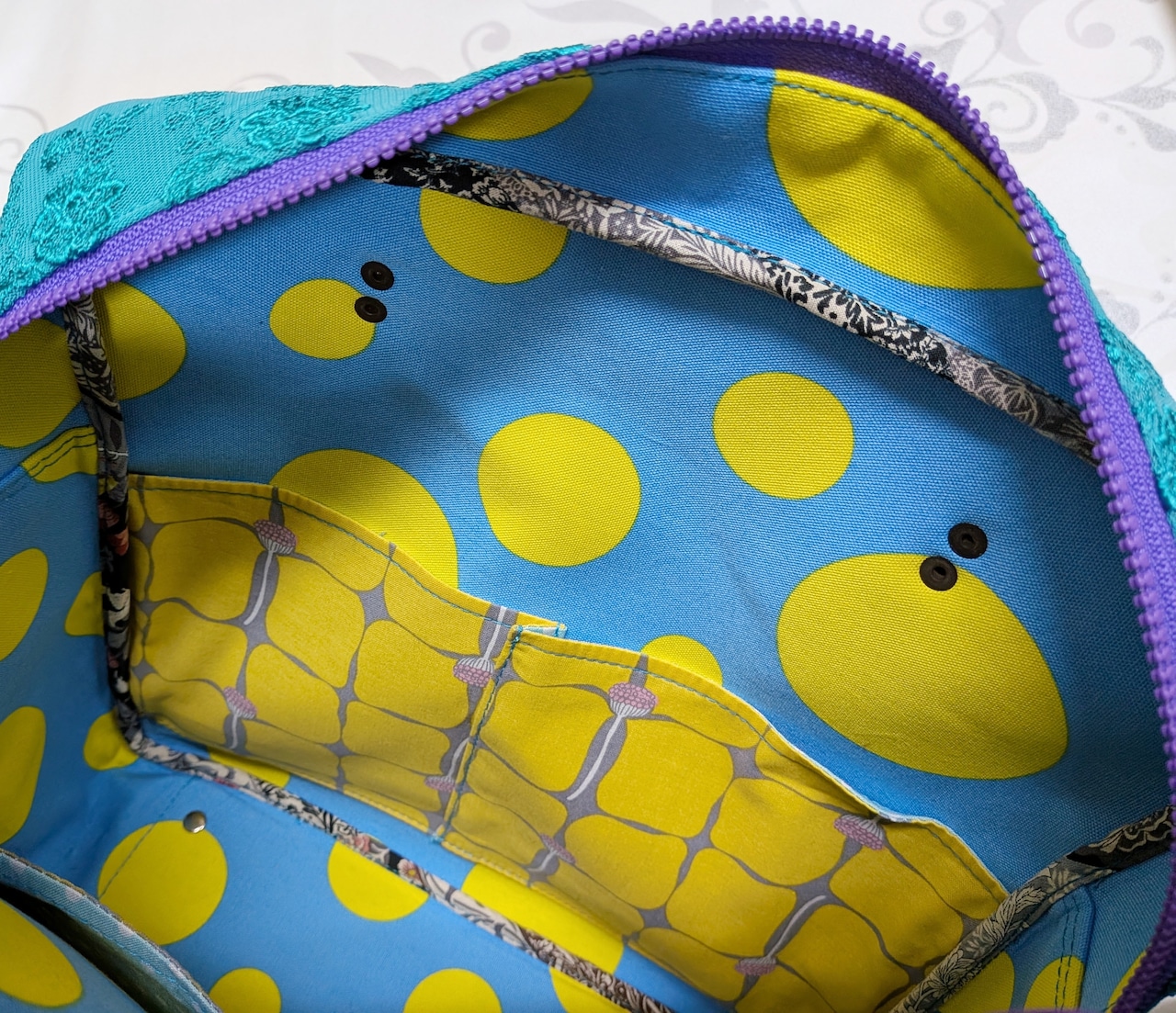 持ち手は紫の光沢ある織生地