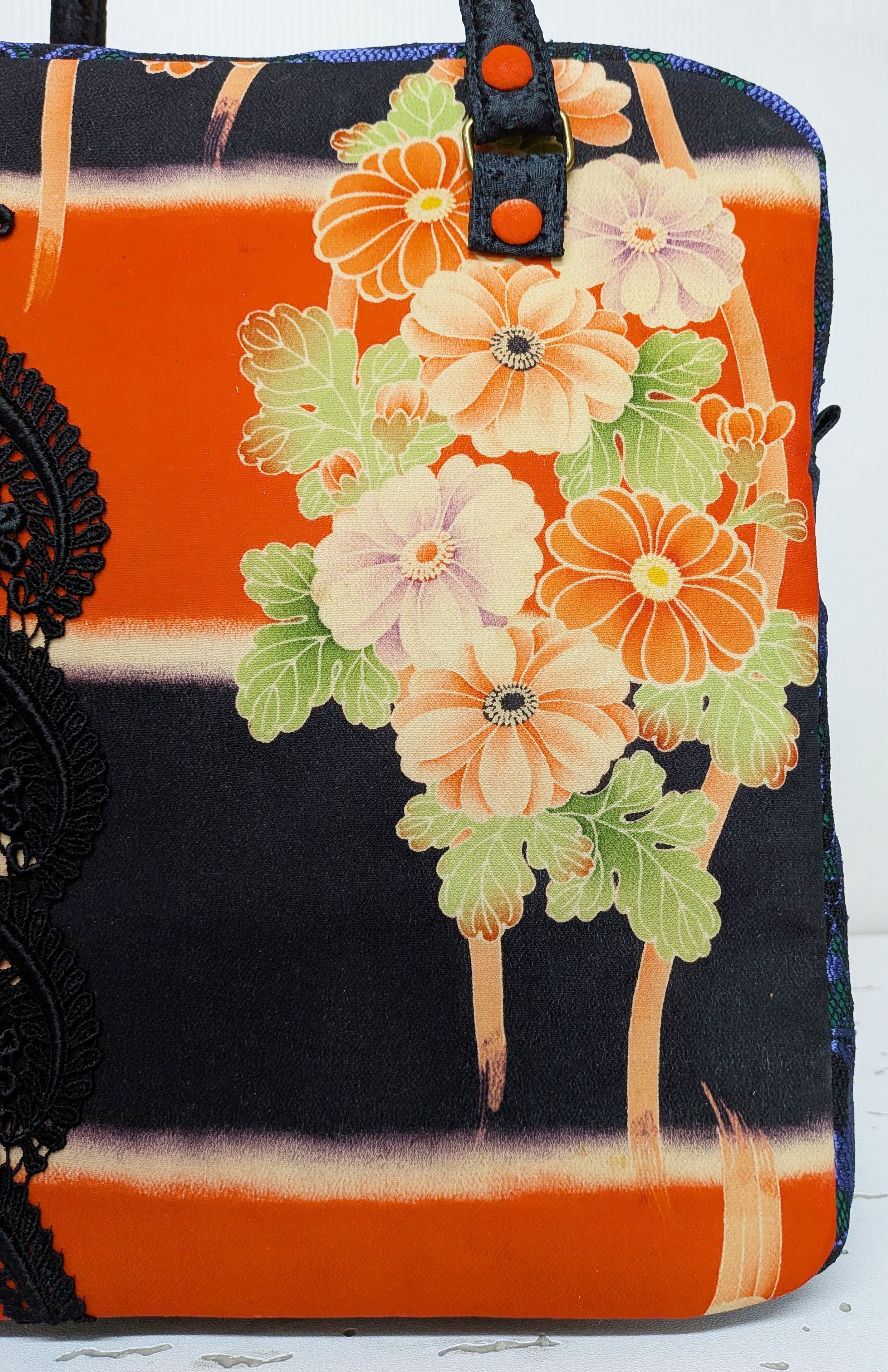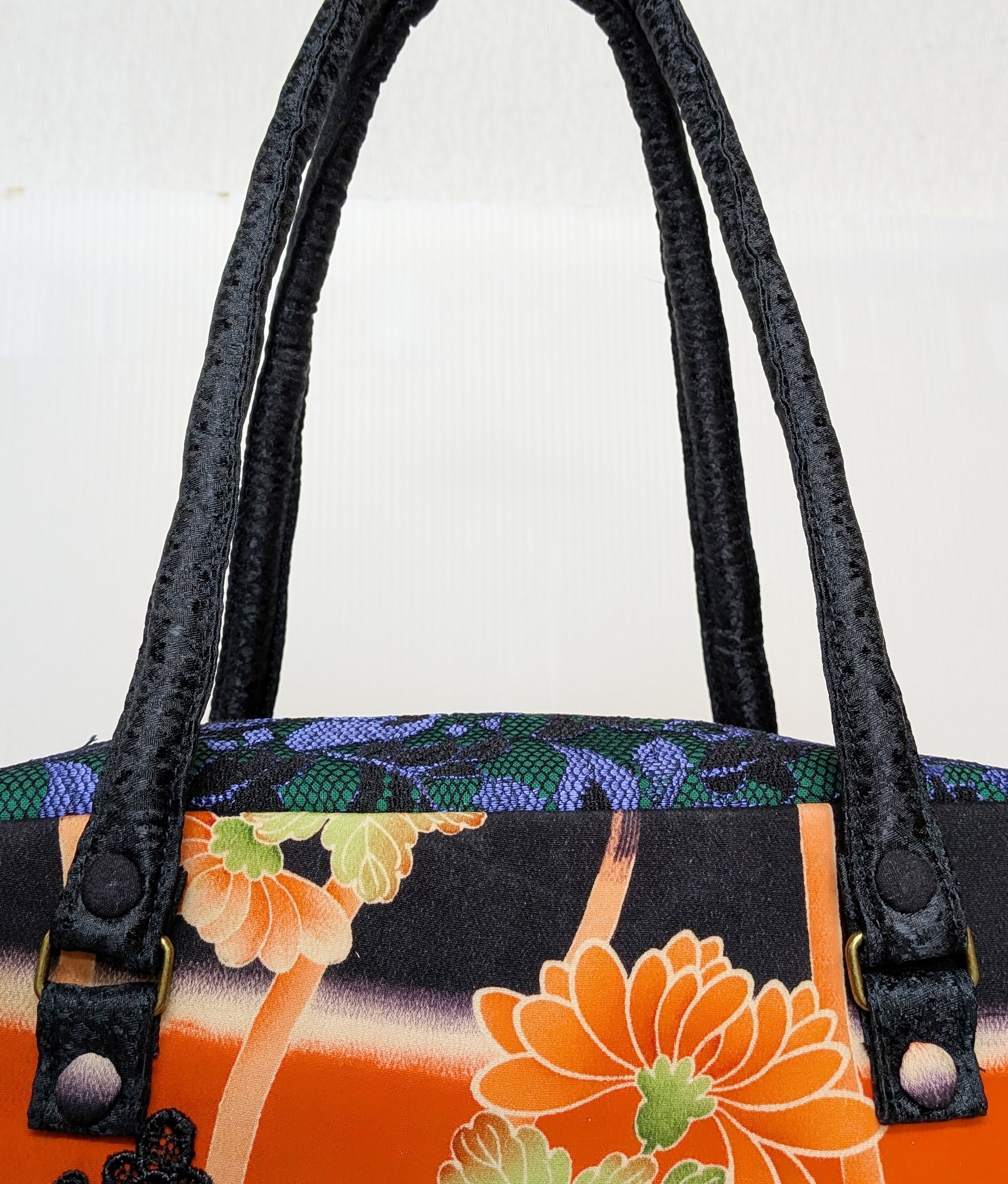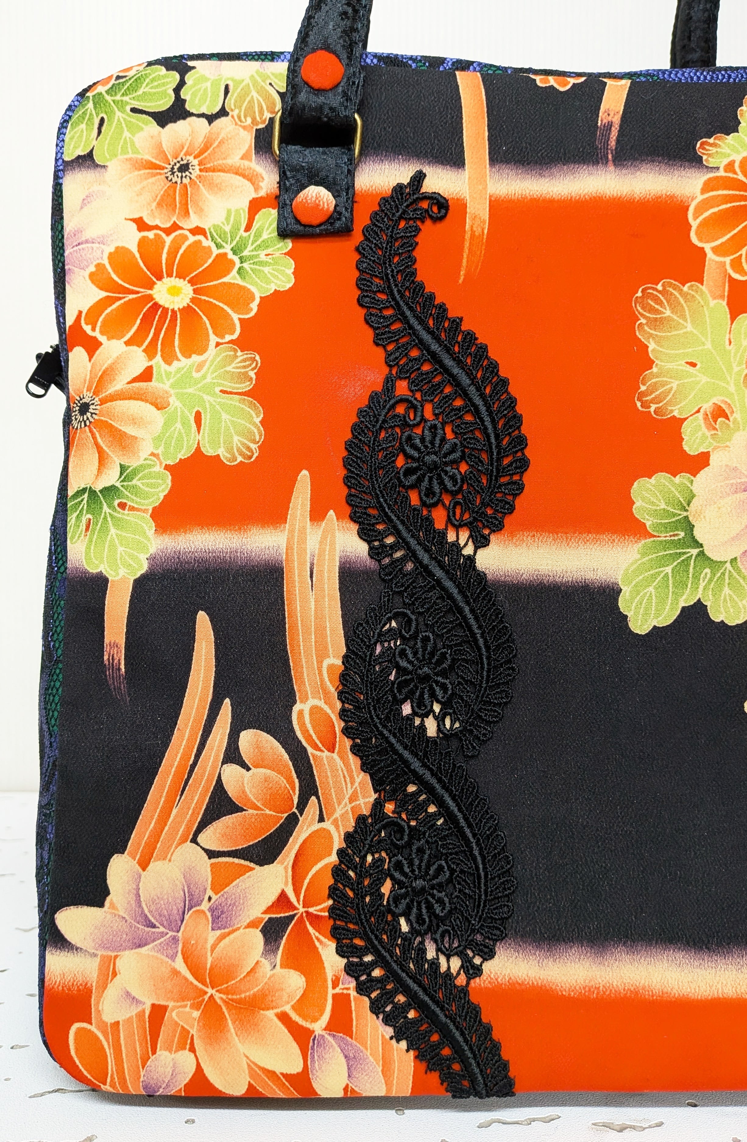 carréバッグ 黒・オレンジの着物×黒・紫レース