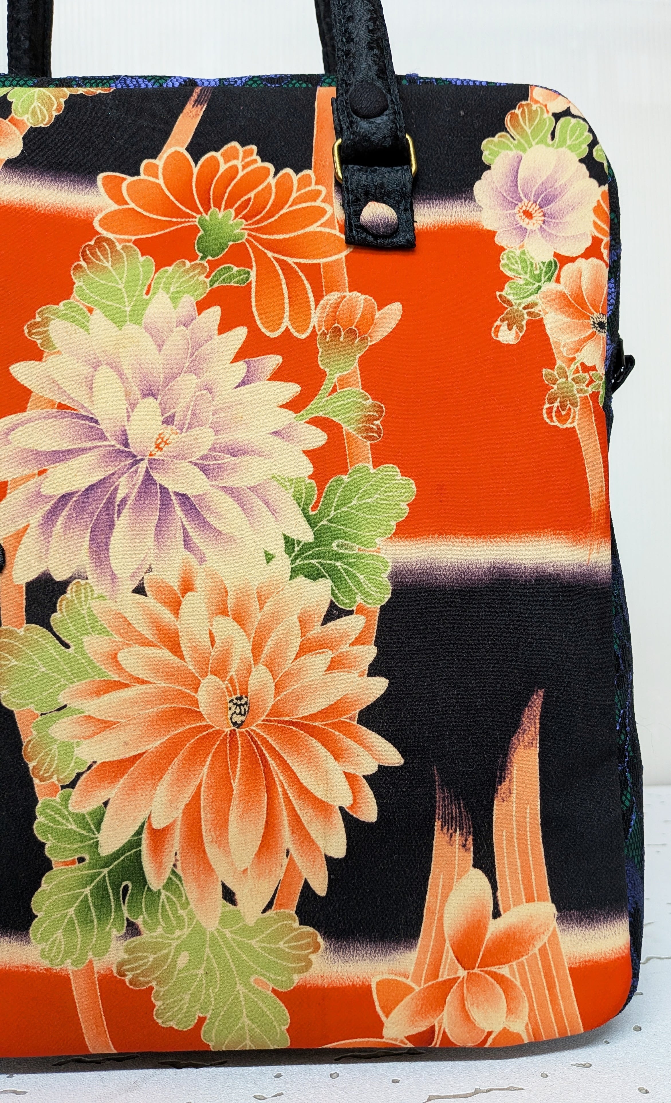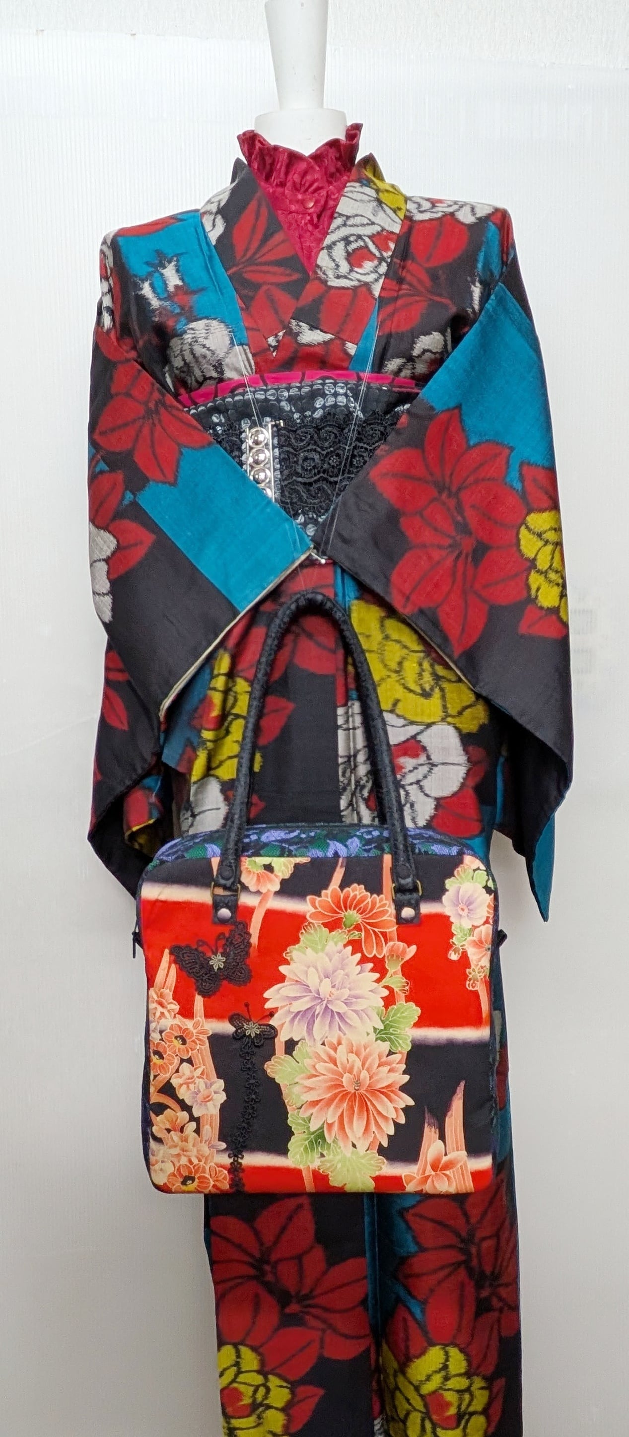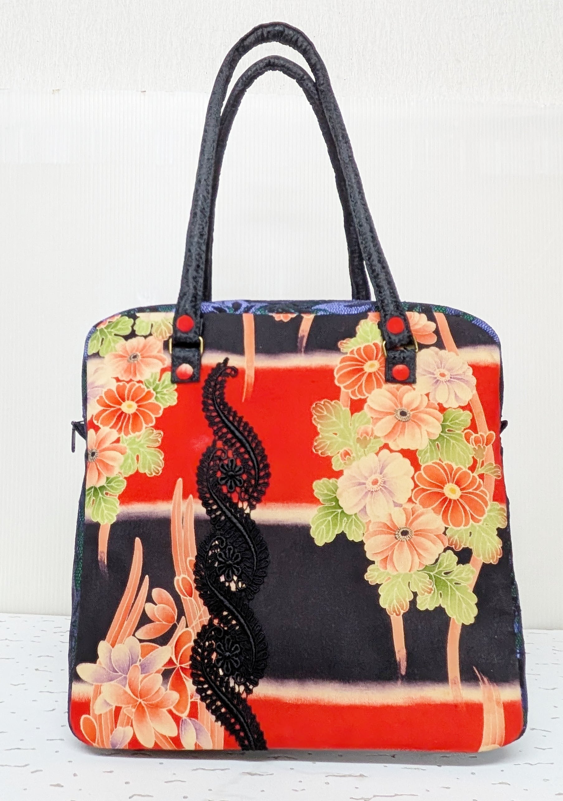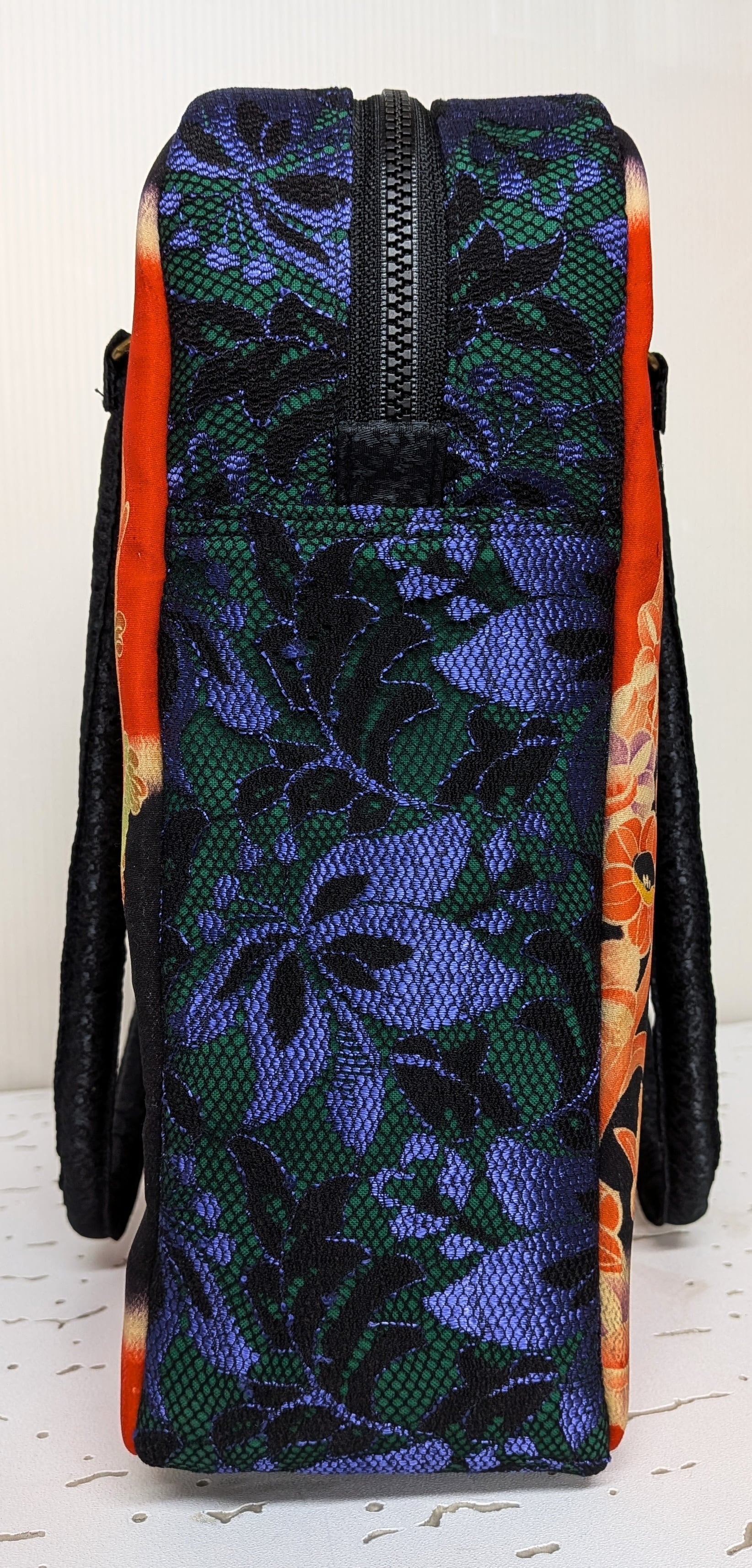 carréバッグ 黒・オレンジの着物×黒・紫レース
